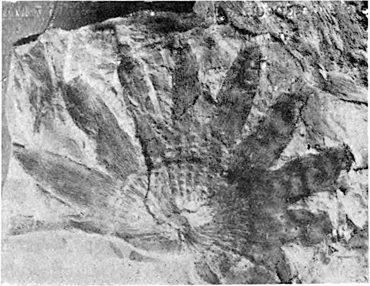 This Scanian Rhaetic type[1722], including Anthrophyopsis crassinervis, A. Nilssoni, and probably A. obovata Nath., is characterised by very large obtusely pointed pinnae reaching at least 20 cm. in length and over 3 cm. in breadth. The veins are often 2 mm. apart and form long polygonal meshes. Nathorst figures small circular patches on the surface of the lamina. Raciborski[1723], on slender evidence, refers a fragment from the Jurassic of Cracow to this species.