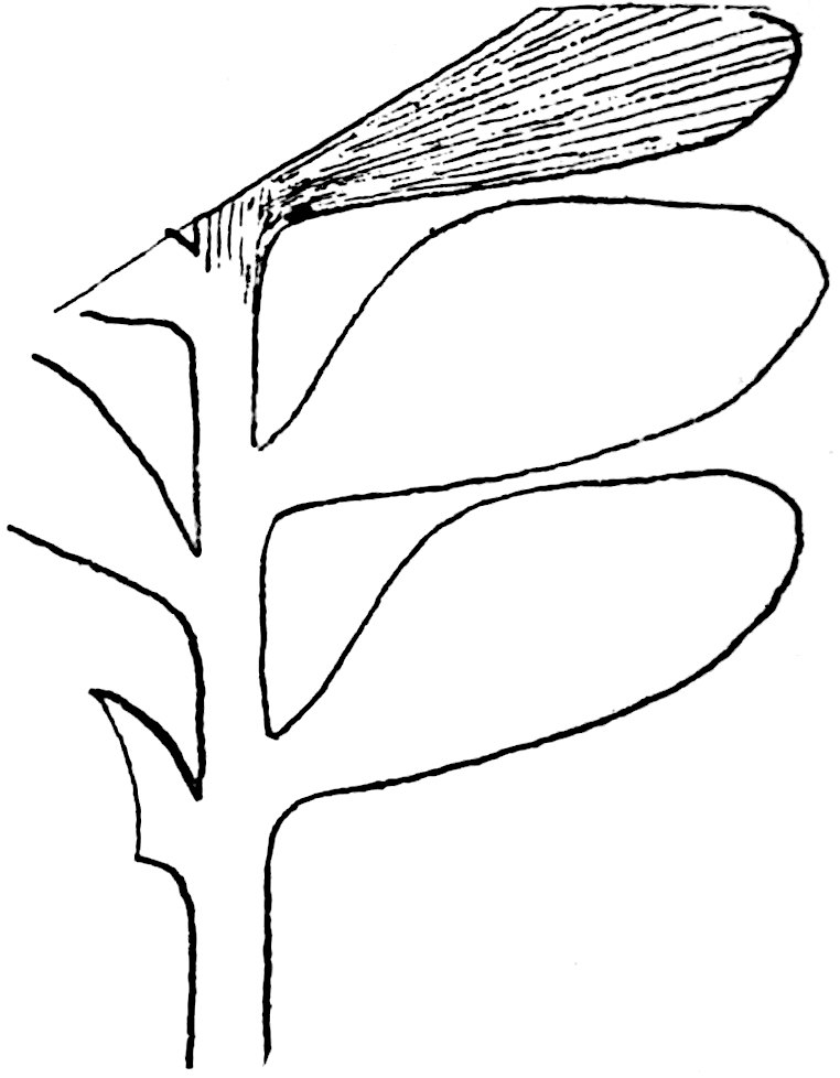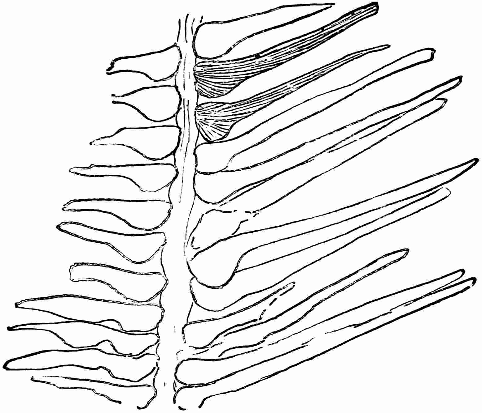 The specimen, from the Lias of Lyme Regis, drawn in outline in fig. 605, is an almost perfect frond: the pinnae are obtusely pointed, slightly falcate, and there is a prominent lobe on the upper edge of the base of the laminae.