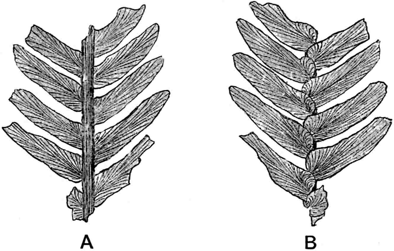 Fronds pinnate; pinnae usually more or less falcate, occasionally straight and with parallel sides, attached obliquely to the upper side of the rachis; imbricate or separate, the upper edge of the base of the lamina strongly auriculate, the lower edge rounded; apex obtuse; veins strongly divergent especially in the lobed base and extending obliquely to the upper and lower edge of the lamina.