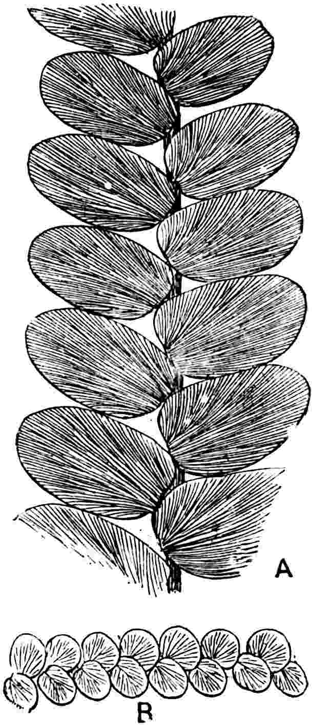 A Jurassic species[1554] similar in the long and narrow form of the frond to O. Beani but distinguished by the much smaller segments 543and by their more orbicular lamina (fig. 606, B). In habit the fronds agree closely with the Fern Nephrolepis Duffi. Leckenby’s species, Otopteris tenuata[1555], is probably the same as Zigno’s O. Bunburyanus, the type-specimen of which in the Padua Museum consists of a long and narrow frond with leaflets not exceeding 8 cm. in length; the rachis is hidden by the imbricate auriculate bases of the leaflets. Feistmantel[1556] refers to this species some pieces of very narrow fronds with overlapping pinnae from Upper Gondwana beds in India. A still smaller form is described by Möller[1557] from Bornholm as O. tenuissimus, and O. Bunburyanus is recorded from the same flora. O. Feistmanteli Zig.[1558] agrees in the form of the frond and in its short and broad pinnae with O. Bunburyanus.