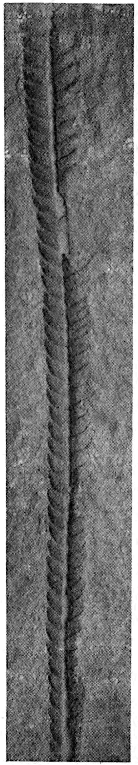 A Rhaetic species founded[1614] on specimens from Persia and described also by Zeiller[1615] from Tonkin represented by fronds 5551 met. long and at least 15 cm. broad. The segments, 3–7 cm. long and 8–18 mm. broad, are often set at right-angles to the rachis; the edges are parallel but the lower edge bends upwards at the apex. The veins are simple or forked and approximately 0·3 mm. apart.