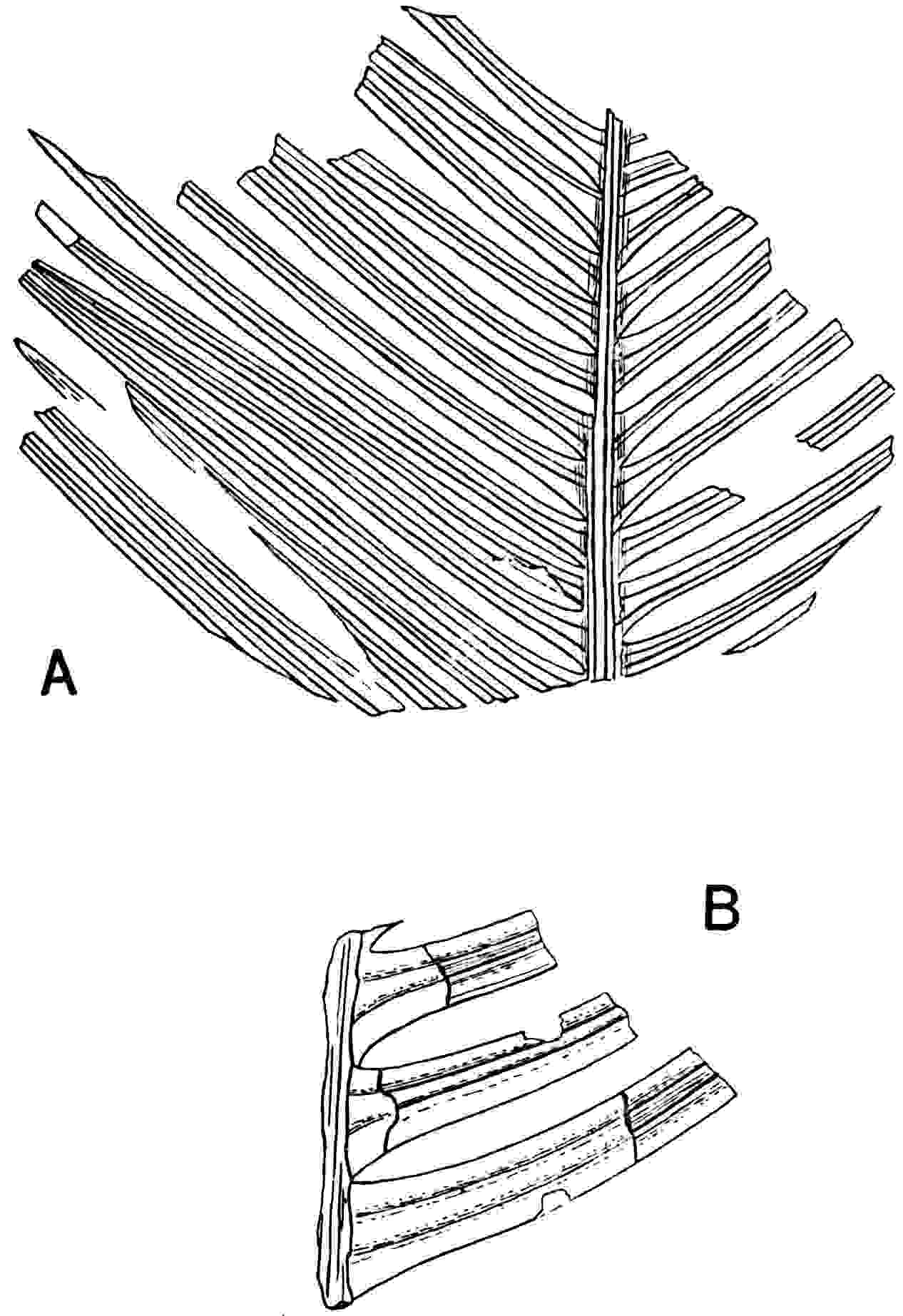 The fronds of this Cenomanian species from the West of Greenland reach a breadth of 16 cm.; the rachis, 1 cm. broad, has two 563parallel ridges on the upper surface and to these are attached at a wide angle the broad bases of narrow linear pinnae reaching a length of 9 cm. and a breadth of 2–3 mm. (fig. 617). The pinnae are thick and separate and each has a double ‘midrib’ consisting of two parallel lines (fig. 617, B) which are occasionally replaced by one. The so-called double ‘midrib’ represents the two prominent ridges bordering the groove. The stomata, confined to the median groove, are approximately circular and the short epidermal cells have sinuous walls[1648].