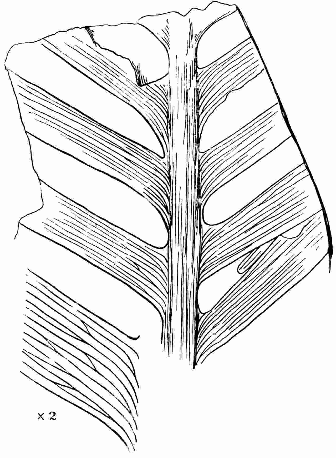 This genus[1738] was established for certain pinnate fronds agreeing in habit with Ctenis sulcicaulis but distinguished by the almost complete absence of any cross-connexions between the veins. Some of the forms with narrow pinnae closely resemble species of Zamites, the distinguishing feature being the decurrent lower margin of the leaflets. Though such fronds might not unreasonably be included in Ctenis, it is more convenient on the analogy of the occasional occurrence of Glossopteris fronds with very few anastomoses to employ a distinctive designation.