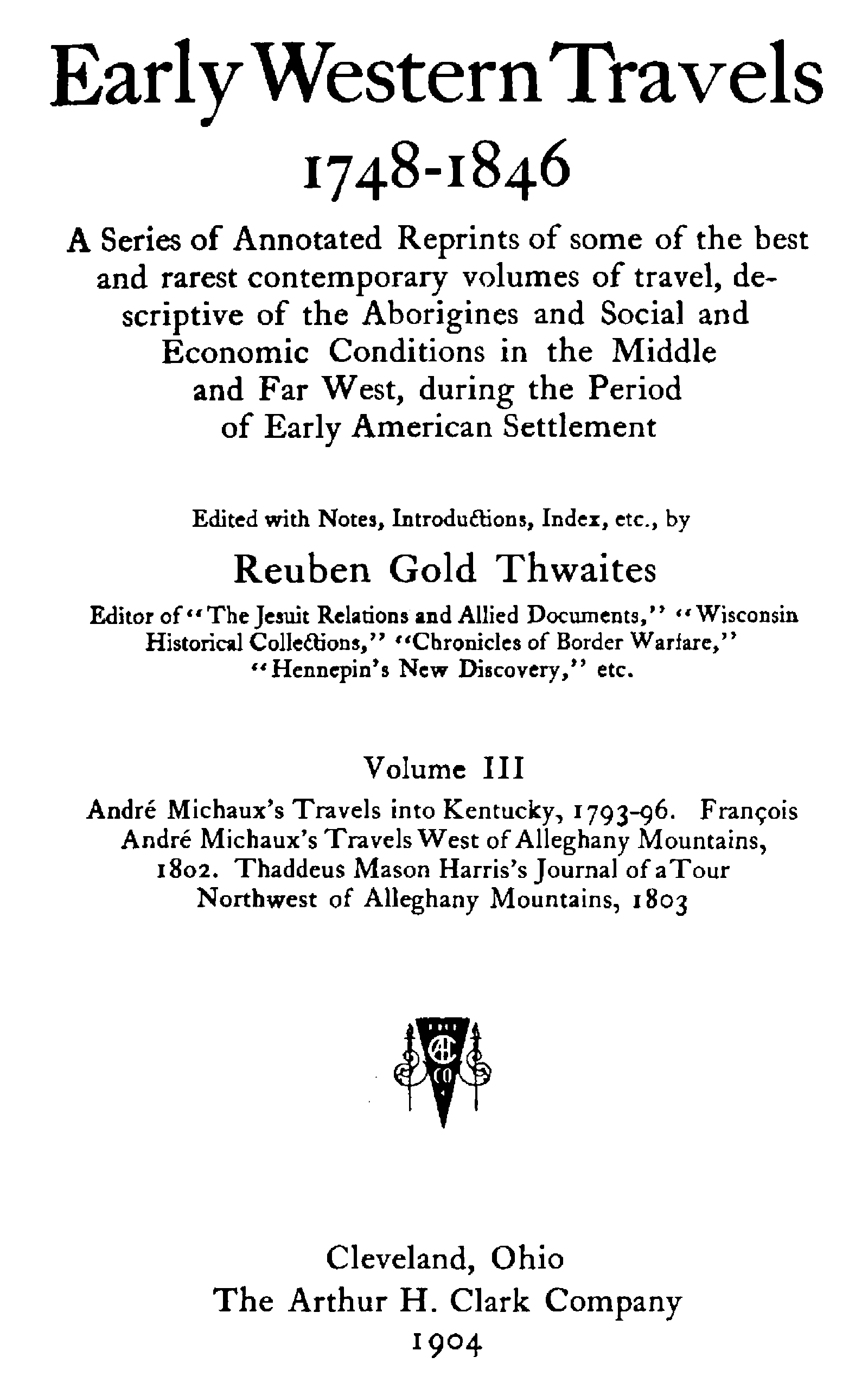 We publish in this volume André Michaux’s journal of his travels into Kentucky from 1793-96, Englished by us from the French version in the Proceedings of the American Philosophical Society; a reprint of the English version of Travels to the West of the Alleghany Mountains, made in 1802 by his son, François André Michaux; and a reprint of Thaddeus Mason Harris’s Journal of a Tour into the Territory Northwest of the Alleghany Mountains, made in the Spring of the Year 1803—omitting, however, as unnecessary to our present purpose, the appendix thereto.