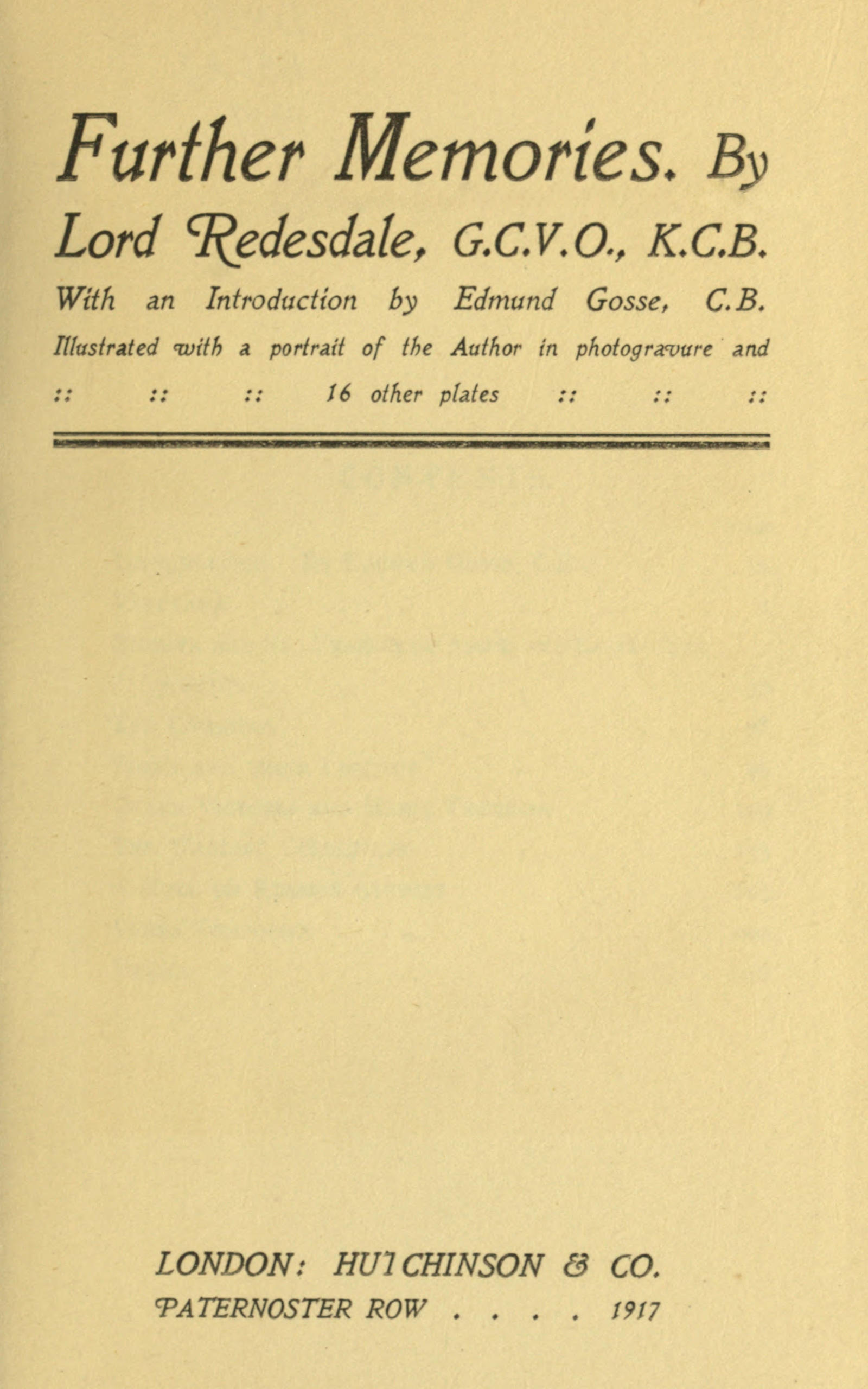 “One of the best books of the last five years. Lord Redesdale’s ‘Memories’ are not merely interesting, they are indispensable.”—Daily Telegraph.