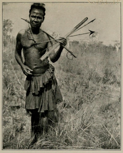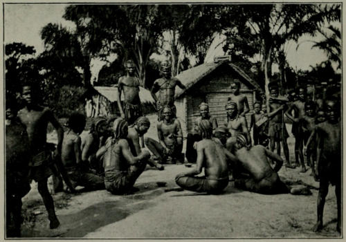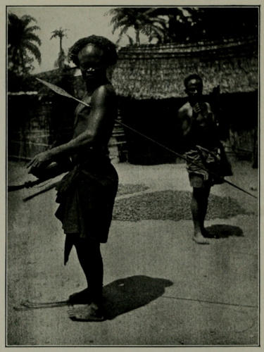 Like their cousins from Luano the Bambala around Kikwit are very peaceable and are chivalrous even in their methods of war. They have a curious habit of holding a sort of tournament, a different affair to serious warfare. Should two villages have a dispute a day and place is appointed for a battle. The bush is cleared to give a fair and open field, and the warriors of each side turn out to settle the matter in the lists. Torday has witnessed some of these encounters. The proceedings commence with a good deal of bombastic speech, and the champions of either village hurl insults at the heads of their opponents. “Ah, you, there, with the ugly face, I’ll give you something in a minute,” and other similar remarks[256] are bandied about. Then the arrows begin to fly (at very long ranges) and the battle is in full swing. Very little damage is done in these encounters. Occasionally one or more of the warriors receive scratches, but it is very rare for any one to be seriously hurt, and at the conclusion of the engagement, that is to say when the combatants are weary, there is no ill-feeling between the opposing sides. If a man should happen to be killed the affair becomes much more serious and will perhaps develop into a serious war, in which the conflicting armies will attack one another whenever they meet, and which will certainly be stubbornly fought out with considerable losses on either side.