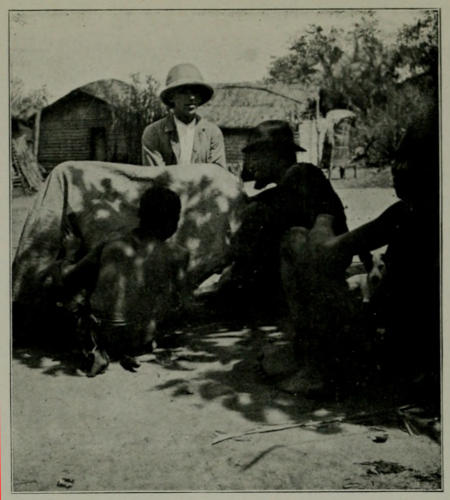 Upon our return to Alela after our trip in the Bapindji country, we had to wait for several days for the arrival of stores which we had left at Kikwit, and during this time we did all the work we could among the local Babunda, but owing to their extraordinary reticence, the results of Torday’s researches among them are meagre compared with those obtained among the Bushongo. Although almost every evening singing in the village told us that some ceremony was in progress, we could see very little of what was going on, and the only event of any particular interest[273] which we witnessed was a funeral. The body, wrapped from head to foot in palm cloth, was laid out in a hut, around which the mourners were wailing and playing small rattles, the men covered with a red dye and the women with ashes. After some hours of weeping, in which a great number of persons took part, the corpse was carried out of the village and buried in the plains, where nothing but an old cooking-pot was left to mark the last resting-place of the dead. While waiting at Alela we were able to form some estimate of the skill which our followers possessed in the use of bows and arrows. We invited a few Babunda who happened to be passing to take part in a shooting contest, and the rivalry between the various tribes of which our caravan contained representatives and the local marksmen became extremely keen. We found that all our people, including little Buya, were remarkably good shots, and the rapidity with which they could loose off their arrows was extraordinary. We noticed that some of the Babunda shot in a kneeling position, and that our four southern Bambala possessed a curious method of defence, in which they used their bows as shields. Torday had previously noticed this custom, and, taking a blunt arrow, we put it to the test. My gun-bearer, Mokenye, gave us a demonstration of it. We threw the arrow at him, and, as it approached, with a sharp turn of the wrist he struck it aside with his bow, and so skilful was he in warding off the missile that only once did we succeed in getting an arrow through his guard. Of course this method of defence would be by no means certain against an arrow which, having been shot at a short range, was travelling at[274] a great pace; but the Bambala assured us that they could really be sure of defending themselves from arrows which were moving less swiftly at the end of a long flight. The result of our shooting competition was that we learned we could depend upon our followers to at least hold their own with their national weapons should we have the misfortune to be attacked by the Bakongo or Bashilele. Alela, like the whole of the Kwilu region, is a comparatively healthy spot. In this district there are few mosquitos (upon the shores of the Kwilu there are practically none), and the tsetse fly appears to be so rare that we often wondered whether the great plains around Alela could not be turned into a pasturage for domestic cattle if the beasts could be brought into the country without bringing the fly with them. In the whole of the country we visited during our two years’ journey domestic cattle are not to be found, with the exception of a few head imported by the white man at Lusambo and Dima. Further to the south, however, near the Portuguese frontier, the natives breed a certain number of these animals, and also sheep. At the present moment the only domestic creatures which the natives keep in those parts of the Kasai which we visited are chickens and goats, although a few sheep, which have been imported from the south, are here and there to be found. Although, owing to the lack of shade, the sun at Alela can be very trying, there is often a cooling breeze sweeping over the plateau which serves to temper the fierce heat, and at the time we left Alela—that is to say, at the end of April 1909—rainstorms and tornadoes were of frequent occurrence, the rainy season having continued, so we were informed, rather later than usual.