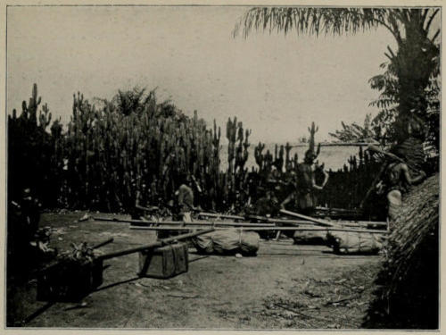 We learned later on that this, the elder of the two chiefs, rather fancied himself as a wizard, and doubtless intended to show off his magical powers before his people[317] by frightening us out of his village. After a time he returned and told us that as a declaration of war he intended to steal the chickens which he had just presented to us. We showed him where they lay, and he thereupon took them, our people, acting under our order, making no effort to prevent him, for we did not wish to force on hostilities by any act of violence on our part. For the rest of the evening no one came near us, and it was noticeable that the women and children kept within the stockade, while the warriors, who had previously been walking about unarmed, most of them now carried their bows and arrows when they passed our camp. Our position was by no means a comfortable one. I have mentioned that the shed in which our belongings lay and our tents were closely surrounded by cassava bushes, under cover of which it would be very easy for a native to creep up unobserved and shoot us as we sat in our chairs; obviously any attempt on our part to clear the ground by cutting down their crops could only result in the Bakongo immediately attacking us. Our camp was situated well within arrow-range of the stockade, and although the shed beneath which we were sitting would doubtless keep out any arrows shot from the village, which at a distance of forty yards would already be beginning to drop, we and our men would certainly be very much exposed at any time that we left its shelter. Any attempt at removing our camp to the plains, a little farther away from the village, would only have been mistaken for flight, and would have induced the Bakongo to attack us immediately. The only thing to do was to stay[318] where we were, to avoid any act of aggression, and to appear as unconcerned as possible. We summoned our Bambala porters and now informed them for the first time that the two long cases which we carried with us contained ten rifles; for up to this moment we had kept our people in ignorance of the fact that we possessed any arms except our own sporting guns. Upon seeing the rifles, our trusty Bambala suggested that, instead of issuing these arms to them, we ourselves should endeavour to shoot such of the Bakongo as carried most arrows directly hostilities began, so that our people, covered by our firing, might rush up and take the weapons of the slain, and so be provided with arms in the use of which they were practised, instead of the rifles with which they had never learned to shoot. This we decided to attempt as soon as any hostile move was made by the enemy. Our Bambala porters then proceeded to dress their hair with oil, and to smear their countenances with Reckitt’s blue, and, thus beautified, waited calmly for the trouble to begin. At this crisis, as always, our men behaved in a most exemplary manner, never causing us a moment’s anxiety as to their loyalty, and never complicating affairs by an aggressive act or word to the Bakongo. That night we loaded all our guns before we put them by our bedsides, and we placed in readiness two boxes of rockets usable in a 12-bore shot-gun, which, although they were incapable of inflicting any damage, we thought might possibly strike terror into the hearts of the Bakongo. After we had turned in we heard a meeting being held within the village, at which several speakers held forth at great[319] length, but although we could just make out that war was the subject of discussion, we could not hear sufficiently well to gather any information as to what the natives intended to do. We fully expected to be attacked that night, but, as a matter of fact, the Bakongo never left their village until morning, and then no one approached our camp. The women and children still kept out of sight, and we noticed that all of the men carried arms, and many of them were busily occupied in putting new tips or feathers upon their arrows, in manufacturing new bows, or in paring down stout creepers with which to make bow-strings. Our porters had purchased a good deal of food upon arriving at Kenge when the natives were friendly, so we told them on no account to accept any eatables from the Bagongo should they offer any for sale, for we feared that some attempt might be made to poison them; for ourselves we had plenty of European stores, so that for the time being we had no need to bother about our food supply. But the outlook was not a particularly bright one, for it was evident that the Bakongo, if they did not attack us, would certainly attempt to starve us out, and we should therefore be eventually compelled to retreat towards the Loange, in which case it was practically certain that we should find that the people of Kenge had caused the inhabitants of the villages through which we had passed previously to rise against us upon our return journey, and we should therefore be compelled to fight our way to the Loange with only twenty-four men, many of whom would be occupied in transporting the objects which we had already bought[320] for the Museum; for we were firmly determined that, even if we had to abandon the rest of our baggage, we would do our best to bring away the things which we had procured at a cost of so much trouble and expense. Even if we could succeed in reaching the Loange River, we were sure that the natives would have concealed all the canoes, so that our plight by the riverside would hardly be better than it was at Kenge. During the day, possibly as a result of advice given by some speaker at the over-night assembly in the village, the Bakongo proceeded to clear away the cassava bushes around our camp. A worse piece of strategy could hardly be imagined, for whereas the bushes had offered perfect cover for any one who wished to creep up and shoot at us as we sat at meals or writing in our shed, now that they had been removed we had an open space around us, in which we should be a