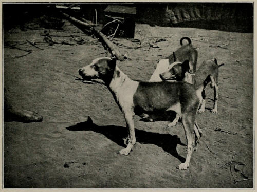 The village of Bwabwa is a new one, and it lies in open country on the edge of the forest belt which borders the Loange River. As we approached the village we noticed two peculiar fetishes or charms. The first of these consisted in a miniature harpoon, a model of those used for trapping elephants and hippopotami, suspended over the path close to the entrance to the village. The second one consisted of a high post placed in the centre of the village, from the top of which hung creepers extended to each of the four corners of the stockade. This latter charm, I believe, was considered particularly efficacious against lightning. Dilonda accompanied us to Bwabwa, with the chief of which village he was very friendly, and upon his recommendation the natives received us well. We pitched our camp in the cleared ground outside the stockade and settled down to make ourselves agreeable. Upon hearing that we were hunters, the Bakongo at once suggested that we should on the morrow accompany them to the river and endeavour to shoot some of the buffalo which come down in the early morning to drink. Next day, therefore, we started before daybreak together with two or three of our Bambala and a few of the Bakongo, and having been ferried in a couple of very small canoes across the Loange, we spent several hours in a search for game. Although we were not successful in obtaining a shot, we found fresh tracks of[300] buffalo, elephant, hippopotami, bush-buck, and sitatunga in large quantities, so that this part of the Loange River must be considerably richer in game than most of the districts we passed through. We visited several grassy islands near to the western shore, and while doing so we came to the conclusion that we had been rather foolish in allowing the Bakongo to take us there, for should they have suddenly taken into their heads to get rid of us, nothing would have been easier than for them to depart in their canoes and thus maroon us upon the islands, from which, owing to the strength of the stream, escape would have been quite impossible. When we returned in safety to Bwabwa, therefore, we determined never again to place ourselves so completely at the mercy of a people who, although they were friendly at present, we certainly did not know sufficiently well to trust. Dilonda stayed a couple of nights at Bwabwa and then returned to his home across the river. He had certainly been most useful to us, for without his introduction I have no doubt that it would have taken many weeks for us to become friendly with the Bakongo upon either bank of the Loange, and in addition to this he had evidently talked a good deal about our clockwork elephant, for the natives of Bwabwa were very anxious to see it. We displayed it once to the chief, but we were very careful not to allow it to become “cheap” by showing it to any passing native who might express a desire to look at it. We first noticed at Bwabwa rather a curious thing about the Bakongo methods of hunting. Like the Bushongo they employ a number of dogs with rattles[301] strapped around them to drive small game into nets in the forest, but among the Bakongo the dogs, although belonging to various individuals, are all under the care of one man who occupies a position somewhat similar to that of the “kennel-huntsman” of an English fox-hound pack, and he daily feeds all the dogs used for hunting. Most of the Bakongo carry little wooden whistles suspended from a string around the neck, but the dogs appear to easily distinguish the note of the kennel-man’s whistle, for they come round him as soon as he sounds it to partake of the cassava dough with which he feeds them. As a rule the dogs of the Bakongo appear to be very well kept.