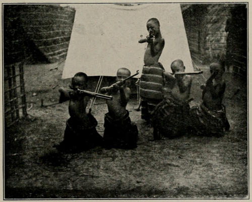 We became friendly not only with the Nyimi and the great dignitaries of his Court, but with all classes of natives during our stay at the Mushenge, and particularly with the children; two or three of the king’s little sons, all under seven years of age, and some of their playmates became our constant companions. When we got up in the mornings we would find the children waiting outside the tents eager to be allowed to perform some service for us, such as holding a mirror while we shaved. All day long they would sit beside us in the shed in which we worked, or accompany us upon our rambles round the village, and at meal-times they dearly loved to take the place of a “boy” and hand us our food. We used to spend most of our spare time playing with these youngsters, and I remember once, just after the death of the herald alluded to above, I returned from a[223] search after guinea-fowl to find the children playing the parts of dignitaries at a funeral ceremony, in which Torday, reclining in his deck-chair, was acting as the corpse! The children were very good as a rule, and remarkably fair in all their games and disputes. Two of them, by name Mikope and Mingi Bengela, who were bosom friends really, would fight just after we had partaken of our midday meal. These conflicts were often most amusing, the blows delivered (which, by the way, never landed upon the person of the adversary) were so terrific that their impetus frequently caused the champion who dealt them to sprawl upon the ground, and tears of rage would spring into the hero’s eyes as, time after time, they beat the air. But should another child attempt to do anything so unfair as to touch either combatant during the fray both Mikope and Mingi Bengela, forgetting their own differences, would turn upon the intruder and belabour him as hard as they could. As soon as one of these fights was over (that is to say, when the combatants were weary or when anything else more exciting attracted their attention) it was forgotten, and the two gladiators became as friendly as before their dispute. During the time that food was very scarce I undertook a trip to the north-west of the Mushenge, towards the confluence of the Kasai and Sankuru, in the hope of being able to shoot some game and send the meat back to Torday, for at this time several European travellers were expected at the capital, including a Belgian journalist, a military officer, and Colonel Chaltin, famous in the Arab wars, who had recently become director of the Kasai Company. I stayed in several small villages in a thickly-wooded country, where[224] I tried to obtain an elephant. The natives told me that the forest on the left bank of the Sankuru is rapidly spreading southwards towards the Mushenge, and I was shown several places now clothed thickly with young woods which had been open country in the memory even of natives of about twenty-five years of age. Elephants are fairly numerous in this country, but I was never able to obtain one. They pass their time in the low-lying part of the woodlands, which is mostly submerged and in which the undergrowth is so dense as to render a very near approach necessary before even so large a beast as an elephant can be seen, and when one is continually slipping about on roots concealed from view by the water one can scarcely hope to get very near to a beast without attracting his attention. Upon the only occasion when I did really believe that I should succeed in bagging an elephant the native that accompanied me got such a bad attack of nerves that he bolted, making off in one direction while the elephant retired hurriedly in another, and leaving me to follow him as best I could through a forest swamp with darkness rapidly coming on. I had no choice but to follow the man, for the whole country was under water, often as deep as one’s waist, and I knew that I should have very little chance of getting out of the woods at all if I allowed my companion to get out of sight or earshot. After several unsuccessful attempts to get an elephant I realised that I was wasting time and sending Torday nothing to eat, so I turned my attention to some buffalo which I heard were to be found in a clearing near a tiny village called Ikwembe. Ikwembe was a miserable place, consisting of only about ten extremely[225] dilapidated huts, and the natives, who had probably never received a white man to stay in their village before, did not seem particularly pleased to see me. They were not in the least hostile, of course, for they knew that I travelled under the protection of the king, but I received a very poor welcome. Upon my explaining that I wished to shoot a buffalo, the chief, a very old man with a deformed leg, in which the knee would seem to have been dislocated in early youth and never put into place again, with the result that the limb had not grown properly, informed me that a herd of these animals habitually fed close to the village, and that his people would show me where to search for them. Just as the sun was nearing the horizon, and I was endeavouring to secure a guinea-fowl for my supper, a native came hurrying to call me, having seen five buffalo in the clearing. When I returned, bringing with me the head of one of the beasts, I began to be regarded as a welcome guest, for the Bushongo are not keen enough hunters to often succeed in killing buffaloes themselves. At dawn I sent off my six men (all the porters I had, for I was travelling with practically no baggage) to carry the meat to the Mushenge, of course presenting the inhabitants of Ikwembe with their share, and in the evening I again found the buffaloes and bagged another. On my return to Ikwembe the old chief formally requested me never to leave his village! After a few days, however, in the course of which I added nothing but a duiker to my bag, my popularity began to wane. Unfortunately much of the meat that I sent back to Torday was bad before it reached him, for I had had to wander
