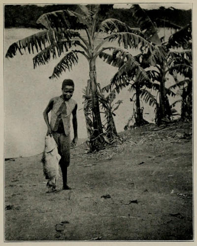 The ferme chapelle at Pana consists of a plaster building used both as a schoolroom and a chapel, and, with one or two small huts, forms one side of the post. Opposite to this is situated the house of the catechist, while between the two, lying some fifty yards back from the bank, is a row of huts inhabited by the children resident at the mission; there are one or two other houses for the children lying just outside the three sides of a rectangle thus formed. The catechist, who rejoices in the name of Louis, and his wife Marie are in command of the post, sharing the labours of teaching, and superintending the cultivation of crops and instructing the very small children, some of whom cannot exceed three years of age, in the rudiments of cooking and other household duties. There are not many children actually resident in the mission—at the outside they cannot exceed twenty—but there are a fair number of Bayanzi villages scattered about in the neighbourhood, from which the children arrive early in the morning, returning home at sunset. Short services are held two or three times a day, the congregation being summoned by the beating of an old tin, for the ferme chapelle of Pana cannot yet boast of a bell. After the early morning service the children receive instruction in the principles of the Roman Catholic faith, while a few of the elder ones, who have commenced learning to read and write, spend some time sitting about with pencil and paper copying down the alphabet and short sentences from a very elementary “reader,” their work being overlooked by Louis when his class teaching is at an end. In the afternoon all the children work in the fields, or, if a steamer is expected,[245] fell and cut up timber ready for fuel. Louis appeared to us to fulfil his task remarkably well. I do not know exactly what his qualifications as a teacher were, but he certainly kept his post neat and tidy and maintained perfect order amongst his pupils, to whom I think he was greatly attached, and who certainly seemed devoted to him.