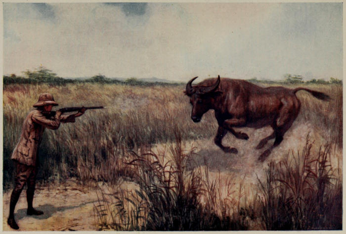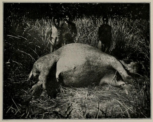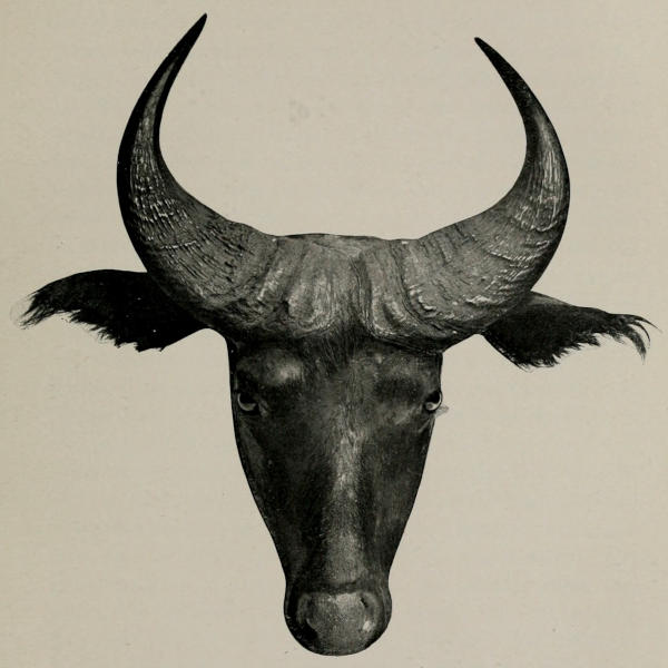 The country between the Kwilu and the Inzia at this point consists of gently undulating grassy plains, entirely devoid of bushes, in which are situated many pools and swamps where buffalo drink and linger long after sunrise to crop the sweet grass. There is also a good deal of woodland such as I have described before, consisting rather of small dense covers than of continuous forest, parts of which are usually swampy, and here the beasts wallow in the shade during the fierce midday heat. The soil of the plains is sandy and the grass is rarely very thick, resembling a thin English crop of hay about five feet high. We usually had to go some distance towards the Inzia before we found our buffalo, the likely spots being shown to us by children from the mission. There is another ferme chapelle on the Inzia, about five hours’ march from Pana, and as the children from Pana frequently visit it, they had often seen buffalo on the way and were consequently able to take us to their favourite feeding grounds. I do not think that we ever went out with these children without finding a beast of some sort. We saw buffaloes in herds[248] numbering from three to fifteen heads, and have counted as many as twenty-seven in one day. To find them, however, one must leave Pana long before daylight, or the increasing heat of the sun will have driven them into the forest swamps before one reaches the pastures. I think that the buffalo in this part of the world are larger than those I had come into contact with near the Mushenge and those whose tracks I saw in the equatorial forest. They also seem to me to be considerably darker than those around the Mushenge. This applies not only to the aged bulls, some of which are almost black, but also to the adult cows, which are of a dark chocolate-brown colour all over. Quite half the animals in any given herd on the Kwilu would be as dark or darker than the bull I have seen east of the Kasai. The horns, too, of both bulls and cows appear to be larger, as a rule, than the specimens I had previously seen. We secured some really fine specimens of both male and female of the buffaloes around Pana, and Mr. Lyddekker, to whom we submitted them, has found that they represent a species of small buffalo hitherto unknown to science, which he has described under the name of bos caffer simpsoni. A mounted head of a female, the sex which displays the most marked difference in colouring from the buffaloes around the Mushenge, is now exhibited in the Natural History Museum, Cromwell Road. As I have already remarked in Chapter V., I cannot help thinking that there must at least be three species of buffalo in the parts of the Kasai district we visited: the buffalo of the Kwilu, that of the Mushenge, and the small animals of the southern portion of the equatorial forest. Whether or not[249] the buffaloes I shot during my trip from the Mushenge are really of the bos caffer nanus variety I am not in a position to state, for their head skins were unfortunately spoilt by the climate, but I know that the males of that district are darker in colour than the mounted specimen of nanus from Nigeria exhibited in the Natural History Museum, whereas the females appear to be of about the same colour but rather larger than the female there shown. Possibly, therefore, the buffaloes from the country around the Mushenge may constitute a different species, as may those of the great forest. I have no right to advance any theory with regard to these latter for, as I have said, I never set eyes on one of them; but to judge by their tracks they appear to be smaller than either of the buffaloes I shot. I was told by a Belgian gentleman who has done a good deal of shooting that two kinds of buffalo exist near Kanda-Kanda, where, I suppose, the dwarf buffalo may be merging into the well-known “Cape” species, but I saw no horns from this part of Africa. Although the buffalo from the Kwilu lacks the enormous strength of his cousin the Cape buffalo, he is nevertheless very tenacious of life, and when wounded is capable of making a most vicious and determined charge. Although I used a powerful rifle I, on one occasion, only just managed to stop the rush of an animal which had previously received two bullets so placed that the wounds that they inflicted must have proved fatal in a few moments. Torday also had an experience with one which might have ended in an accident. We had been trying to secure a couple of animals for the steamer, which was expected that evening, to carry on to Dima. We came across a herd, and[250] singling out the biggest beast I fired at him with my Express; on being struck, the animal turned off into a very small but dense cover, the rest of the herd making off across the plain. When we reached the edge of the little wood in which the wounded animal was, we could hear the beast giving vent to those moaning sounds which a buffalo frequently makes when at the point of death, and which, I think, must always make the sportsman half regret that he had not stayed his hand. Concluding that it would be only a few minutes before the end came, Torday whispered to me to hurry on after the herd with one child from the mission in the hope of securing a second beast, while he waited with another child until the animal was dead. Accordingly I followed the animals across the plain, but being unable to come up with them I returned to Torday, who had waited outside the wood until the moaning had ceased, and then, concluding that the animal was dead, he had gone round to the other side of the cover to take a look at it. He was armed with his 256 Mannlicher, for which he had but two cartridges left. Now if one attempts to load a Mannlicher with a clip containing but two cartridges there is often a chance that the action of the rifle will jam after the first shot has been fired when endeavouring to insert the second cartridge into the chamber, therefore Torday loaded one cartridge by hand and gave the second o