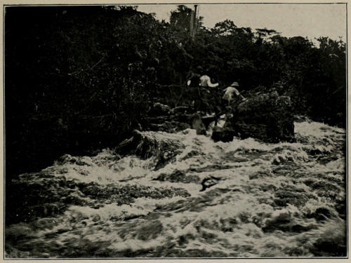 After leaving Mokulu’s village we came once more to the banks of the Kwilu where dwell the Bapindji tribe, and stayed at a village called Bondo. The scenery here is remarkably fine; the Kwilu, which is at this point not more than one hundred yards wide, rushes swiftly through a cleft or ravine in the plateau about nine hundred feet in depth and a mile and a half to two miles at the summit. The surrounding country consists of grass land thickly studded with stunted trees, and only upon the very banks of the river is there any woodland. Here, however, there is a mass of luxuriant vegetation, and the stream rushes violently over a rocky bed beneath the shade of numbers of palm-trees. Just at Bondo the rocks practically put the course of the river into a series of rapids or falls, the roar of which can be heard at some miles’ distance in the calm of the tropical evening. We strolled down from the village to photograph some of these falls in the company of one or two native lads. When we reached the water’s edge these boys stepped into the river with, as we thought, the object of washing their feet. Suddenly one of them sprang into the stream with a cry, was[270] caught by the rush of water, and swept downwards towards some rocks at a terrific pace. The whole thing happened in a moment, and we thought that the boy was drowned before either of us had time to do anything; but when he neared the rocks the current turned him towards the slack water near the banks, and with a few powerful strokes he swam out of the stream into the still waters, and thence calmly walked ashore. Seeing our look of astonishment at his safe return, the lad merely laughed and remarked that if one knew the currents one could always allow oneself to be swept downwards in the rapids with a certainty of regaining the still waters a little lower down, and he told us that the practice of this swimming feat was one of the pastimes of the boys of Bondo. To show us that he was not exaggerating he went through the performance two or three times, and I have never seen any feat which it appeared must so certainly end in destruction, and yet which, the native informed us, is in reality remarkably easy. Whether or not it is easy the Bapindji must be distinctly fine swimmers to attempt it. The chief of Bondo, which, by the way, is an extremely beautiful village with its picturesque grass huts and their little granaries suspended upon poles to keep the food-stuffs safe from the attacks of mice, was an old and very decrepit man with a remarkably suspicious nature. He was much impressed with the exhibition that we gave him of our fetish, the walking elephant, and in the evening he came privately to us and offered to buy it. He told us that owing to his infirmities he was unable to go about his village as much as he should wish, and he had no doubt that many things were said about him behind his back which[271] he would like to overhear, and which would not be said if he were able to go about more among his subjects. If he possessed the elephant he could send it out in the evenings to walk around the village, where it could spy upon his people, and upon its return could report to him any plots against his authority which might be hatched. As we possessed two of these elephants, Torday thought it just possible there might at Bondo be some strange fetish or other object which we had not yet seen, and which we should like to secure for the British Museum. He therefore told the chief that he might possibly be induced to part with the elephant if anything that he specially desired was offered in exchange for it. The chief thereupon commenced to offer us all manner of objects, none of which were of sufficient interest to induce us to part with the toy, and finally he said he would give us quite a large quantity of ivory or one or two slaves in exchange for it. No doubt we should have been commercially the gainers had we accepted the offer of the tusks, but we had not come to Africa to trade in ivory, and we did not wish to compete with the Kasai Company in this matter; so we decided not to sell the elephant at Bondo, and it turned out lucky for us that we retained both the toys until we reached the unknown country. The Bapindji, who in appearance closely resemble the clay-covered Bambala, are, as a rule, a very peaceful people, but not long before our visit they had played a joke upon a trader who had, it appears, shown some nervousness in visiting them. They had crowded round him in the village, and had commenced to touch and examine his baggage, thinking that he was afraid of them because he did not object to their doing so.[272] They quickly passed on from touching his clothing, and finally when the five armed men who accompanied him had thrown down their rifles and fled, the natives proceeded to remove his hat and pull his hair! After this they stole all his belongings and ordered him out of the village. Two or three days later they returned to him everything that they had stolen in perfect safety, for they had only purloined the goods to frighten him, and had doubtless thoroughly enjoyed what they regarded as an excellent joke. The natives of this part of Africa are rather partial to practical jokes, sometimes of rather a grim character. I have heard a story of a certain powerful chief, Yongo, threatening two white men, whose followers had deserted them, with instant death if they did not retire into a hut in his village and remain there as his prisoners. All day long this hut was closely guarded by armed warriors, but in the night when the travellers cautiously peered from the doorway they discovered that all the guards had been removed, leaving them free to escape, but that over the doorway was suspended a human ham, left there, doubtless, to give them one more unpleasant surprise before they made the escape which no one hindered them from attempting.