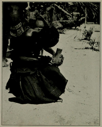 During our week’s journey to the west we visited a number of Babunda villages, one of which, a very large one, had been the scene some few years before of some trouble between the natives and a European. Owing to some misunderstanding, which arose, I believe, from the fact that the white man was accompanied by a large number of followers, the people of this village, Mokulu, were under the impression that the traveller intended to attack them, and accordingly they had commenced hostilities by attacking him. The white man, although he had a number of rifles with him, had to give way before the warlike Babunda; and although, I believe, there were few, if any, casualties on either side, the Babunda were certainly under the impression[268] that they gained a glorious victory. The chief, Mokulu, therefore possesses a very high idea of his own importance and military strength. We visited this man in the hope that he would use his influence, which was undoubtedly great, to induce the natives to sell us a number of objects for the British Museum. When we arrived in the village he welcomed us cordially, but very quickly broached the subject of an exchange of presents, mentioning the fact that he was a very important personage, and that he hoped we would remember this in selecting the present we should give him in exchange for the goat and chickens which he offered us. We gave him a pretty substantial present, and then began to discuss the purchase of curios. Mokulu assured us that there were many of the objects we required, such as carved wooden cups, embroidered cloth, weapons, &c., in the village, and that if we would give him a further present he would certainly be able to secure us a great many of them. We therefore promised him a present, and he departed into the village ostensibly with the purpose of requesting his subjects to deal with us. Shortly afterwards he returned, but no one brought us any curios for sale, and upon our inquiring if he had been unable to find any, he simply laughed and said, “O yes; the objects are coming now,” and left us. After this had happened three or four times he asked us to give him a present in advance, and having received it he again returned to the village, but came back empty-handed. Whenever we mentioned the subject of curios to him, he simply laughed and looked at us with a twinkle in his eye, and not one object could we buy in his village. The fact is he had not the slightest intention of[269] helping us in any way, and he had certainly swindled us of the goods we had given him. As a rule, of course, it is far wiser never to give a present to a chief until one is quite certain what one will get in exchange for it, but in this case we knew that if we did not treat Mokulu handsomely we should stand no chance whatever of obtaining anything from him. We therefore speculated, and lost; and I think that Mokulu was far more pleased at the knowledge that he had cheated us than he was with the goods we had given him.
