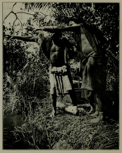 When I arrived at Bishwambura I found Torday under a shed outside the stockade surrounded by an angry crowd of Bakongo all demanding payment for carrying loads, and it appeared very much as if a breach of the peace would follow his refusal to give everybody present a wage. He was adamant, however, and finally the people of Bompe returned home in the evening, grumbling and discontented,[306] leaving us to get on as best we could with the people of Bishwambura, whose acquaintance we had thus made under by no means favourable circumstances. It was not to be expected that they would be very friendly towards us, for they shared the dislike which all the other Bakongo felt towards the white man, and our dispute with the people of Bompe, although unavoidable, was hardly likely to make them particularly friendly towards us, so that we were not surprised to find ourselves treated once more in the same way as among the Bankutu of the equatorial forest. The people would sell us no chickens, and for some time declined to show us where to obtain good drinking water. Our men, however, soon found a clear stream, and we had purchased at Bompe a sufficient supply of living fowls to meet our immediate requirements, and as the Bakongo were not averse to selling food to the Bambala, our predicament was not a serious one. The chief difficulty lay in persuading the natives to carry us on to the next village. They flatly refused to take us over the rolling grassy plains which lay to the eastward, for they told us that a party of Badjok traders were encamped in a village in that direction, and that these Badjok, with whom the Bakongo were friendly, would not allow the white man to be brought anywhere near them. This struck us as rather remarkable, for we knew that the Badjok were enthusiastic traders, who like nothing better than to purchase goods imported from Europe and to sell ivory and rubber to the white man; we came to the conclusion, therefore, that this particular party of Badjok must be engaged in buying slaves from the Bakongo, for in the old days, before the arrival of the European Government,[307] these people were noted slave traders, and this unexplored country between the Loange and the Kasai would be one of the very few remaining places where they might be able to carry on this trade unpunished. After a good deal of discussion, the people of Bishwambura agreed to carry our loads on to Kanenenke, some three miles to the south, having previously ascertained that the natives of that village would be willing to allow us to visit them. Torday went on to Kanenenke in advance, leaving me to despatch our baggage with the local Bakongo. This stage of our journey passed off without any untoward incident, but when I joined Torday in the evening I found that he had had rather an amusing experience in the village on his arrival. Upon approaching the stockade he had found two elderly men sitting smoking their pipes beneath a shed; as soon as they set eyes upon him they had jumped up with a squeal, and, carefully keeping the shed between him and themselves, they had anxiously inquired whether he was a human being or a ghost. Torday had assured them, in as much of the Bakongo language as he had been able to learn during our stay in the country, that he was not only human, but really very inoffensive, and that he had brought with him a good supply of things which the Bakongo would like to have, and which he was quite prepared to give them in exchange for food and for their services as porters when we moved on. In the meantime, a number of other natives had assembled to look at him, but it took some little time to persuade them that he really belonged to this world, for I think that the Bakongo had imagined that a “white” man ought to resemble in colour the white earth, something like chalk,[308] which exists in small quantities in this district, so that Torday’s tanned visage by no means came up to their expectations of a European. At last one man, more courageous than the rest, had touched him, and, having satisfied himself that Torday was nothing more than ordinary flesh and blood, had persuaded the others to lay aside their fears, so that when I arrived Torday had settled down and was making himself agreeable to the chief of the village. We stayed some days in Kanenenke, and got on remarkably well with the people there; we were able to take a great number of photographs, and, by dint of giving a few pinches of salt as a reward to those who posed for us, we had no difficulty in obtaining pictures, not only of native types, but of the people performing their various daily occupations. We took several photographs of ladies having their eyelashes pulled out, for no Bakongo lady of fashion would think of appearing with any hair upon her eyelids. The eyelashes are pulled out by another woman so quickly and so neatly that the process does not so much as bring water to their eyes. It was at first somewhat disquieting to observe that after sundown there was scarcely a sober man to be found at Kanenenke, for the Bakongo are extremely fond of palm wine, in connection with the drinking of which there is a curious custom among them. Several times, when entering Bakongo villages, we noticed, at some little distance from the villages themselves, two or three logs placed as if to form seats by the wayside, and we were considerably astonished to find that these marked the meeting-places of clubs. In the evening the Bakongo men come out to bring in the wine extracted from the Elais palm, and they carry it[309] in calabashes to these meeting-places, where groups of friends, to the number of half-a-dozen or a dozen, sit down, smoke their pipes, and drink while discussing the local gossip.