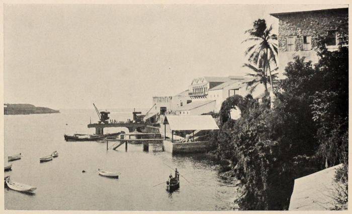 The port of British East Africa—the Island of Mombasa—is a typical foreign mercantile coast town, with its medley of craft, ships, yachts, tugs, boats and canoes manned by seamen of various nationalities, pushing, hustling and screaming in all the tongues of Babel. The handsome old Arab fortress that stands on its jagged rocky prominence as a sentinel at the entrance of the harbour, takes one back to the time before the port was taken over by the British, and when it was used by those who had carried on the terrible slave traffic in the[2] interior. A little to the left is to be seen the British Consulate with its Union Jack fluttering from the mast as the emblem of liberty and justice to all who come under its jurisdiction.