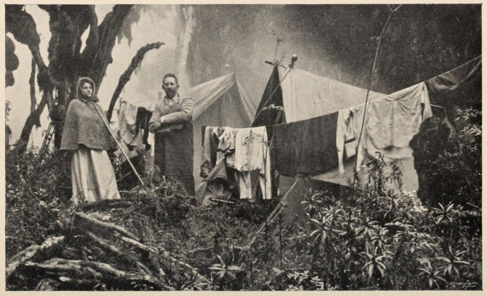 On reaching the top, vegetation assumed an entirely new form. The only trees were gigantic heaths, but it was almost impossible to distinguish them, for the stems were covered with a thick moss, which in some places was 12 inches deep. In colouring it varied from a dark brown to a light golden or deep red. The trees were almost entirely denuded of leaf, and festoons of whitish lichen hung from branch to branch. The ground was very marshy, for the hills that enclosed us emptied down into it numerous small torrents. About fifteen square yards of dry land was found on which to erect our tent and hang up the clothes to dry. Our stout marching boots had already succumbed to the rough usage, and we each took a strong needle and thread to see who could turn out the neatest job. In the evening the rain poured down upon us in a deluge, and continued all night till it even penetrated the double roof of our canvas waterproof tent; besides this, as we were now at an altitude of 10,000ft., the cold was indescribable. Each breath we took seemed to cut at the chest like a knife, and, in spite of blankets and an eider-down, it was impossible to sleep with the damp piercing cold. All the following day the rain continued and kept us prisoners at this indescribably cheerless spot. I had time to overhaul the shattered skirt; it looked a hopeless task, for it really would not bear shortening again. The advice was then given me to cut it up and put it into bands under the knees, which I acted upon on hearing the toughest bit of climbing was yet to come. When we were at last able to push on, and the garment was worn with puttees and a football jersey, I felt like an evoluted man.