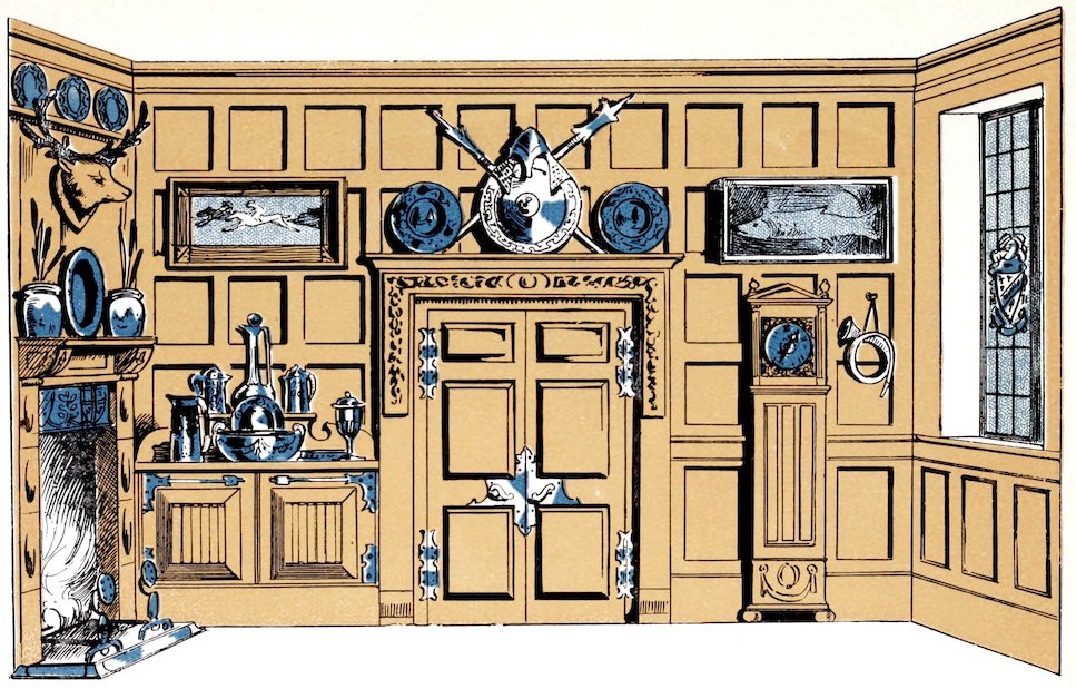 Gothic Baronial Halls:—Distempered walls, red and black patterns, with a little gold, white walls above frieze-rails, dark green hangings in doorways.