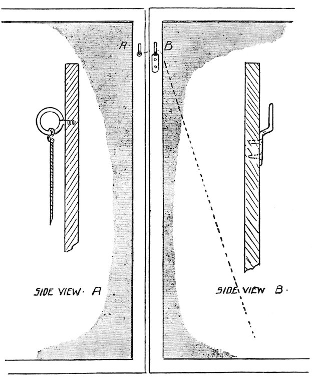 A simple method is here shown for joining two flats together: the cord permanently attached to the ring A, is thrown over the hook B, pulling the two edges of the frame tightly together, the end of the cord then being passed through the nearest fixed screw eye in the stage and slip knotted (see illustration, page 52).