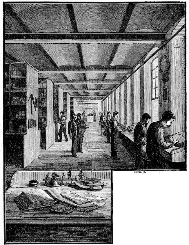 To run this immense establishment, six stationary steam engines are required, which have a combined strength of one thousand horse power. It takes twenty-two boilers, averaging seventy-five horse power each, to furnish the steam for running these engines and heating the buildings. The floors of the buildings have a combined area equal to thirteen acres of ground; and every square foot of the entire area is in constant use. The whole premises, including the fine dockage, covers no less than thirty-two acres of ground.