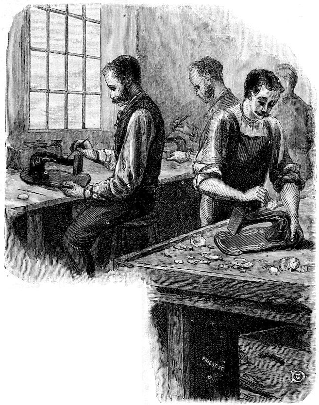 The Needle Department is one of the most interesting features of the entire establishment. Here a coil of steel wire of fine quality is put into a machine, which straightens, then grooves it on both sides above and below the 55spot where the eye of the needle should be, and cuts it to proper length. A girl then takes a handful of needles, and, feeding them into a machine, punches the needle eye at a single blow. Then they are ground down to a point; after which they are tempered, and then the inside of the needle eye is polished out to prevent its cutting the thread. The whole needle is finally polished, and nothing more then remains but counting the shining bits of steel and packing them away in boxes for the trade. The Needle Department gives employment to 100 men and 50 women.