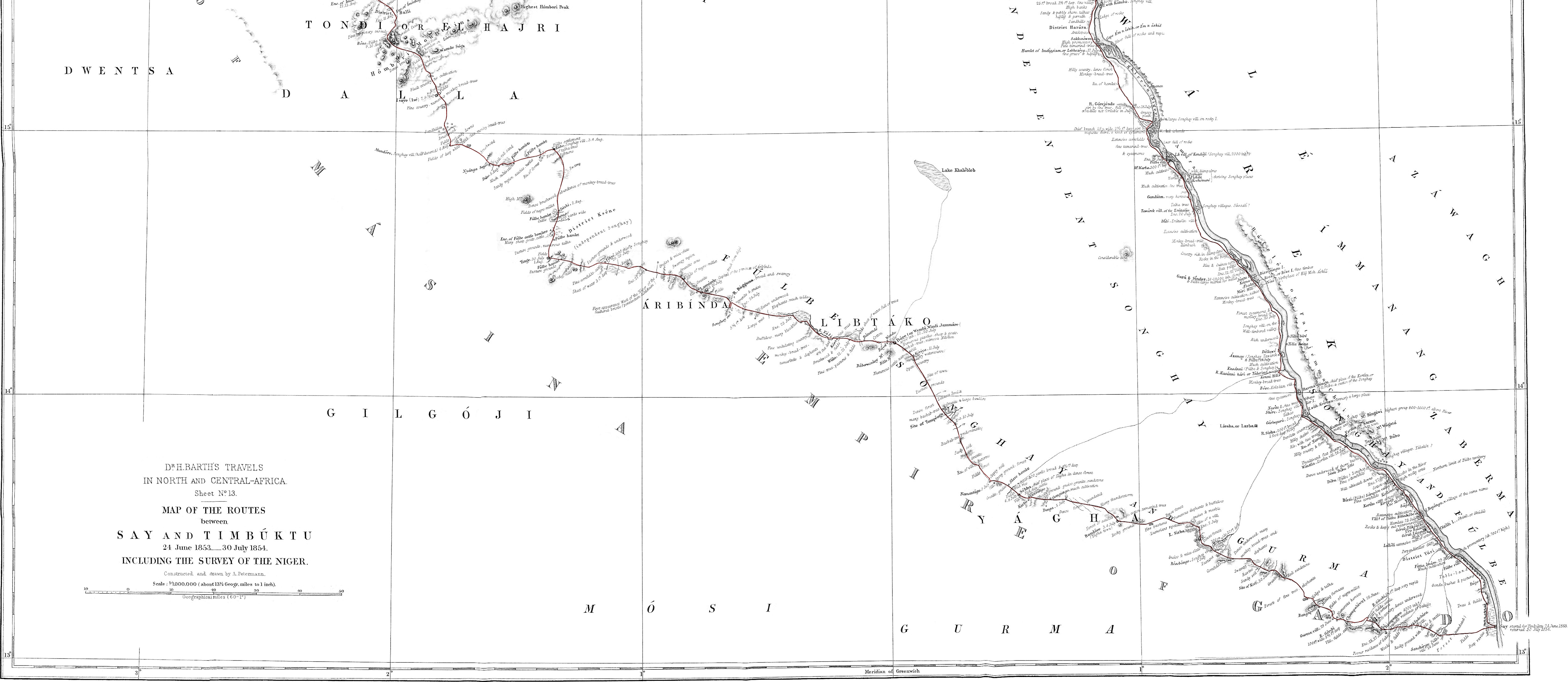 | Leave Gando. — Extensive Rice-Grounds. — Kámbasa. — Swampy Valley with Rice-Grounds. — Gaúmaché. — Unsafe State of the Country. — Gúlumbé, rich Vegetation. — Solitary Pilgrim. — Kardi. — Hausáwa. — Bírni-n-Kebbi. — Situation at the Brink of the wide swampy Valley. — ʿOthmán Záki. — Kóla, and its Governor. — Júggurú. — Zogírma and its Governor. — Dangerous Road. — New Companions. — Tilli. — A Day in the Wilderness. — Site of Bírni-n-Débe. — Dallul Máuri. — Shallow Vales. — The Valley of Fógha. — The Salt of Fógha. — Character of Fógha People. — Importance of Fógha in Ethnological Respect. — Plenty of Kóla Nuts, but no Corn. — Unexpected Generosity. — Dense Forest. — A Solitary Limtúni. — Bóso. — Garbo. — Lanadéji. — Peculiar Cornstacks. — Songhay Farming Hamlets. — Avoid Támkala. — Short Marches. — Tóndifú. — Reach the Niger. — Aspect of the River. — Large Canoes. — Town and Market of Say. — State of Market. — Traffic. — Governor of Say. — No Songhay Interpreter. | |