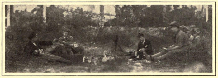 Over the table on which we had eaten, we spread many layers of empty sugar bags, borrowed from the store, whereat, also, we bought some Cuban-made shoes and cigarros arroz. In the upper right-hand corner of the room there was an acetylene generator. In the lower left-hand corner was a baker’s oven. Both were busy on the night shift. Between these two evils we stretched flat on our backs on the table, smoked and dropped the burnt cigarettes, one after another, on the floor of sun-dried tile. We made [88]jokes at our own expense and drew our cotton blankets closer about our necks as the chill of the night increased.