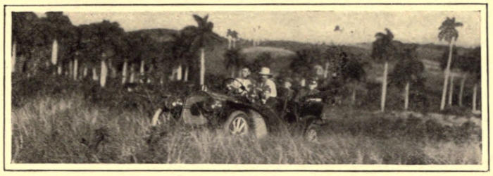 We were the victims of our own imagination rather than the victims of circumstances. We had imagined that Cuba was a sort of national park with an immense system of boulevards. There is one magnificent highway in Cuba, fifty-two [16]miles long, which reaches from Havana to San Cristobal. In publicity it reaches around the world. It has been the course of automobile road races. Automobile writers, attending said automobile races, wrote columns about the beautiful Cubaland, in which the wandering motorist from the north may drive as fast as he likes, while balmy breezes blow across the palm-sentineled macadam. The government has started a road from Havana eastward across the island. Some of this has been surveyed, a little of it graded and it actually exists for a half-dozen miles out of Havana. Down in Santiago province, General Wood has built a road or two. The middle of the island is roadless. There is no continuous travel by vehicle.