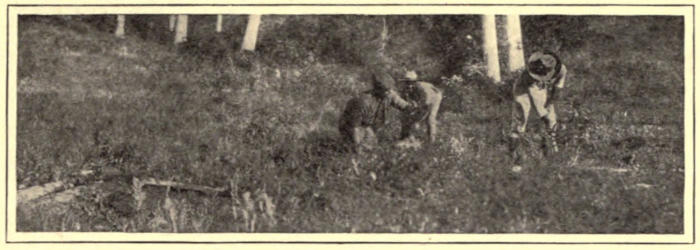 The same old acts were rehearsed with new scenery. Down gullies we twisted to wide rivers, forded them and scrambled up the banks, [102]only to drop again into marsh or perform on the high spots over ruts that the rain could not wash out, but which it made slippery beyond description. We did a lot of driving through fields. Where there were fences, they were either of stone or barbed wire. The latter consisted of two or three loosely drawn strands of wire, held by an occasional permanent post, but, principally, by loose sticks. We cut the wires with pliers, dropped the fence, drove into the field, picked up the fence, joined its loose ends as best we could and drove on. In order to go a mile or two we sometimes had to pass through a dozen fields and cut a dozen fences. The fields which we preferred to the trail were either plowed ground or simply rough land which never had been tilled. Always, it was covered with stones and it was never level.