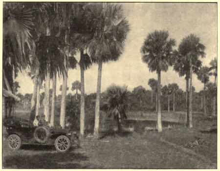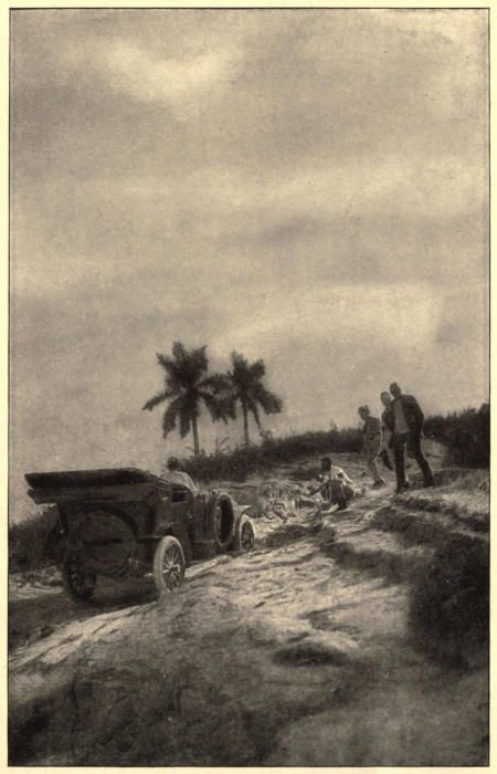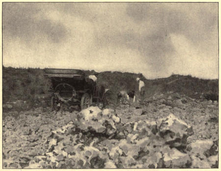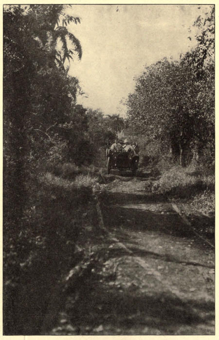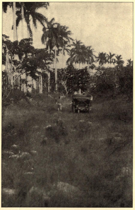 A mere path straggled over and among the hills and was lost in the great patches of native rock. We began to take the country seriously. Trepidation mingled with curiosity. Once in a while a good sort of winding dirt road gave promise of speed, only to change, like a dissolving lantern slide, to a staggering trail over the rocks or between them. The stones increased in number and in size. Each occasional break in the bumping, swaying, swinging, car-racking, tire-tearing progress became shorter. We forgot the stately palms, the queer huts, and the beautiful red flowers. We did not even hear the evening song of the many birds.