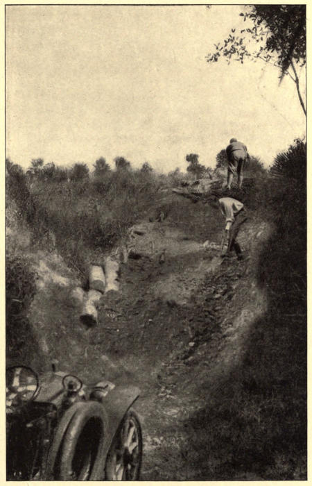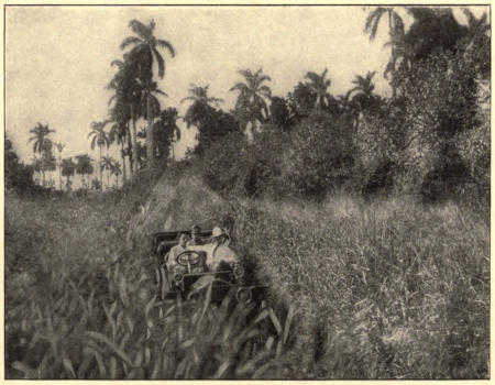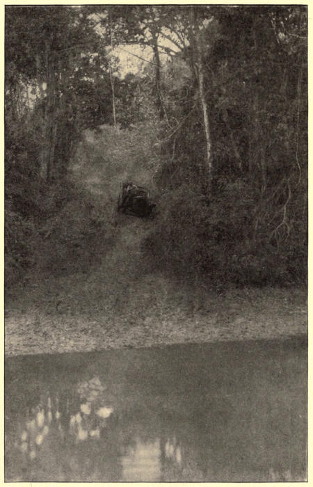 At last an opening was effected. Straddling the gaping ruts, with wheels twisted to the full limit of the springs, Waldon drove the car out of the mess. Leaving behind a great babel of unintelligible tongues, we went on our way toward Placetas. Sliding down embankments, crossing pools, digging trenches to obtain a footing for the wheels in the roughest ravines, we reached the bed of a dried river, whose hard bottom held only occasional pools of water made by the recent rains. We followed this to a hill, from whose brow a level path led to Placetas.