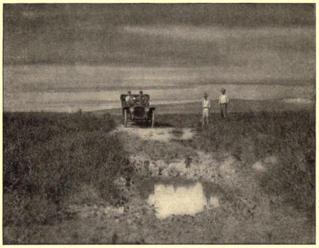 Retracing six or seven miles, we found an old, unused trail through the grass and mud, which looked like a short cut in the right direction. There was no variety and no town. We just plugged along in the mud, sweated under the hard work of crossing washouts, or worried through the tall, damp grass. We knew by our watches that the little daylight was about to depart, and, so, when we found a used trail, we took to it, although we had no idea where it went. At least, the trail meant a country store or a farmhouse.