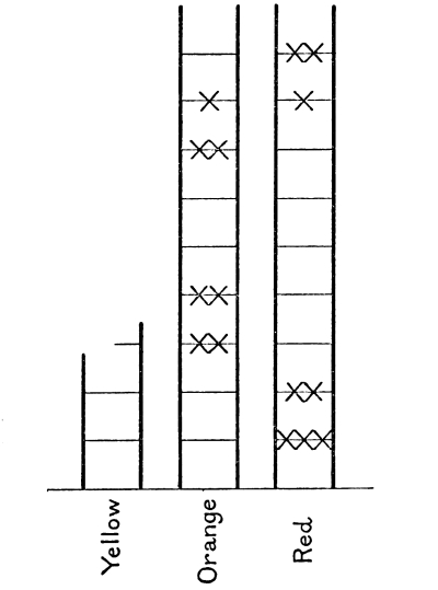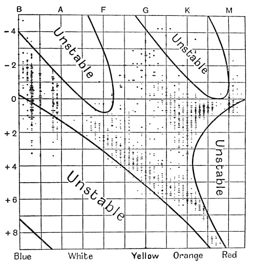 [25] For purely practical reasons the height is not taken proportional to the luminosity but to its logarithm; without some such device as this it would be impossible to represent the range of more than 1,000,000 to 1 in the observed luminosities of red stars.