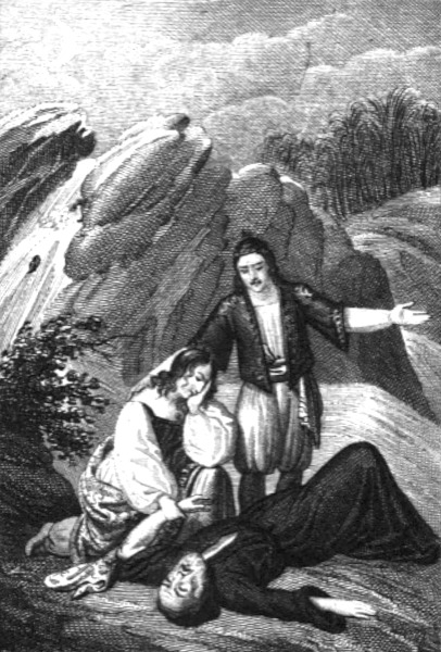 Un giorno ritornando Eugenio dall’Arta ove privati interessi l’aveano chiamato, e non lungi passando dalle rupi della Selleide, visitar volle Demetrio che da lungo tempo più non avea riveduto. Legato il cavallo ad un albero, picchiò alle celle dell’eremo, ma inutilmente: chiamò a nome più volte l’amico della sua giovinezza... niuno risposegli: entrò nella cappella... ed era questa deserta. Sperando tuttavia di ritrovarlo presso la cascata della sorgente, s’incamminò alla foresta degli abeti. — Scendeva il Sole al tramonto, ed il venticello della sera stormir facea leggermente le foglie, allorchè Eugenio vide a qualche distanza il Solitario prostrato sul terreno: avvicinossi a lui palpitando. — Le sue braccia stringeano con forza il monumento [174] di Olimpia, e la sua fronte riposava sul sasso. — Chiamollo a nome anche una volta... tentò sollevarlo... — Vane cure! Quegli occhi erano chiusi per sempre. —