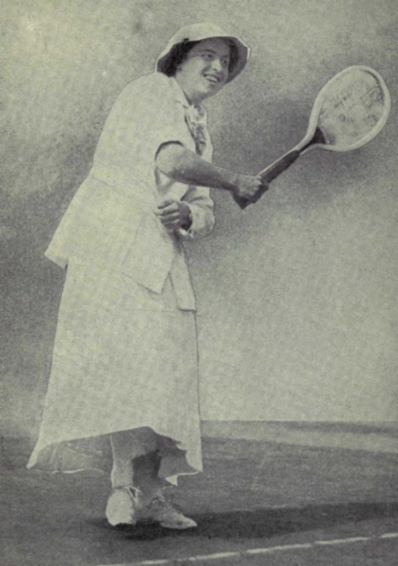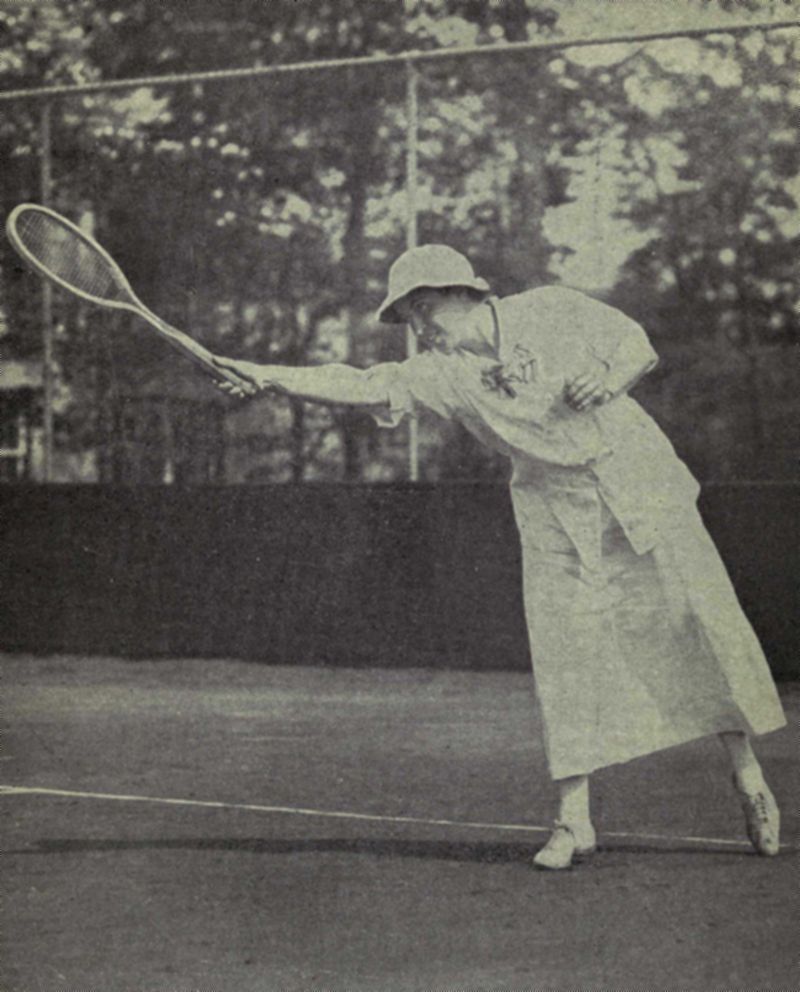 In the beginning a player, whether she wants to go into tournament play later or not, should spend her time learning to swing properly and to follow through; to keep her eye on the ball, and time her stroke correctly, trying always to hit the ball at the top of its bound, thus saving time; to get her footwork right, that is, always be in such a position that the weight of the body can go into the stroke. She should try in practising always to put the ball into some definite part of the court, in order to acquire “control” of the ball. Just hitting it hard, with very little idea of where it is going, is of no use in playing. Let her learn to place her ball well and get good length, that is, keep the ball well back in her opponent’s court, and she will soon find that she can get the desired speed when she wants it.