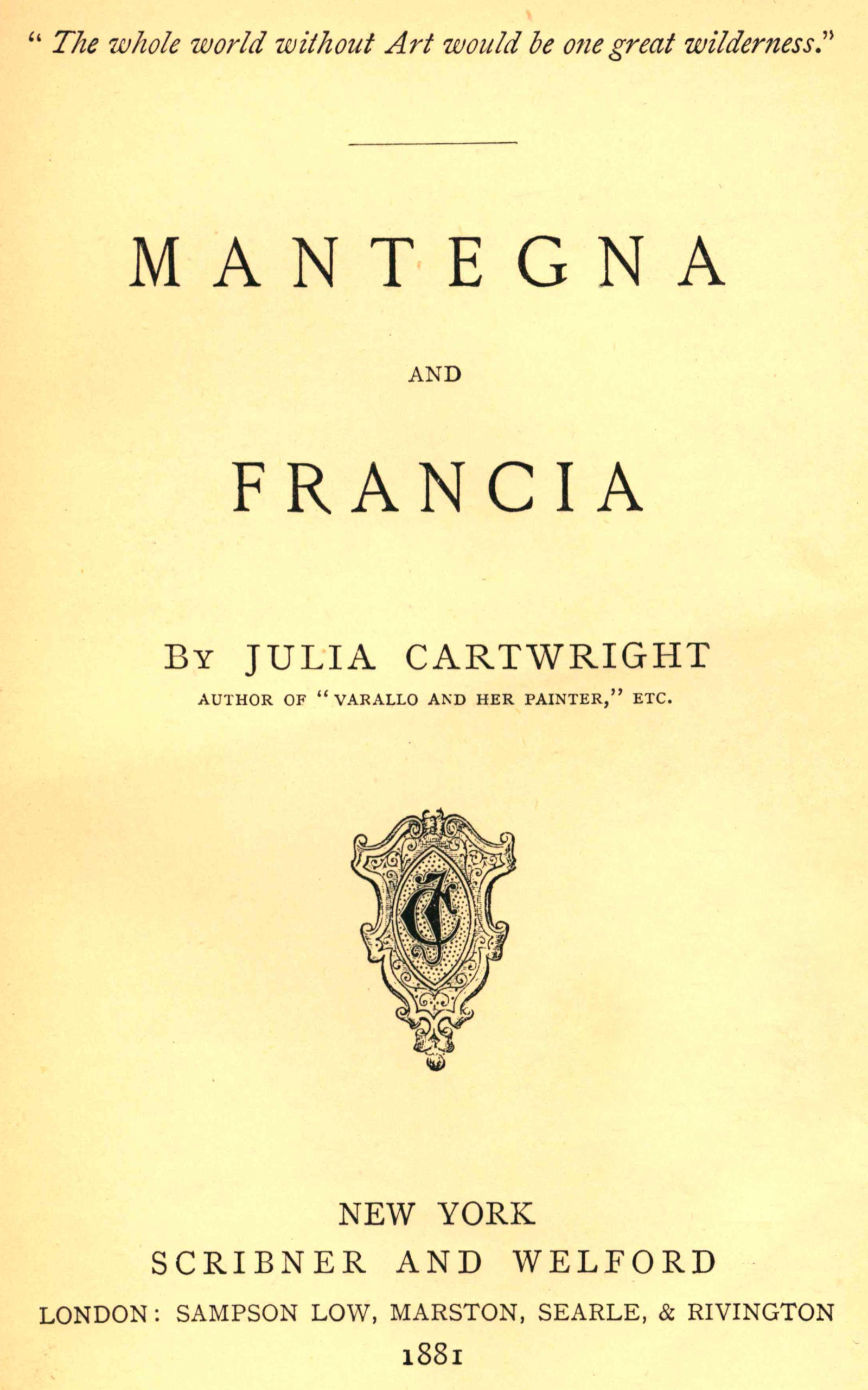 Although no separate biography of Mantegna has been published in England, his life and works have been the subject of much study in other countries during recent years. The thanks of the writer are especially due to Dr. Woltmann, the author of the biography of the painter in Dr. Robert Dohme’s “Kunst und Künstler,” to M. Armand Baschet, Canonico Willelmo Braghirolli, and Dr. Karl Brun. It is to be hoped that before long the last-named of these scholars will give the result of his researches to the public in a complete work on this remarkable man, who was both one of the greatest artists and one of the most striking personalities of the Renaissance.