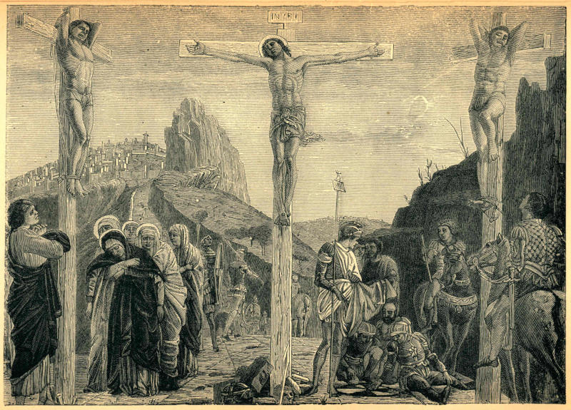 The reproach, although not wholly undeserved, was a curious one in Squarcione’s lips, but the real cause of the breach which took place between the master and scholar was Andrea’s connection with the rival workshop of Jacopo Bellini. The Venetian painter, with his two sons, Gentile and Giovanni, had lately taken up his abode at Padua, and a strong friendship had sprung up between Mantegna and the members of his family which before long led to the marriage of the young Paduan with Jacopo’s daughter Niccolosia. Their union took place while Mantegna was actually engaged on the Eremitani frescoes—probably about 1454 or 1455, since in 1458 he had already two or three children—and becomes an important fact in art history as [9]strengthening the ties between these distinguished artists. The influence each was to exercise on the other was destined to prove great and lasting. Jacopo Bellini, who had spent some time in Florence, was probably instrumental in leading Mantegna to follow Donatello and Uccelli’s models, while from Giovanni, Andrea would learn the softer colouring and delicate feeling that impart so pure a charm to those well-known Madonnas which fill the churches of Venice. Mantegna, on his part, gave back at least as much as he took, and no one can doubt that Gian Bellini owed to his brother-in-law in a great measure his knowledge of classical architecture and perspective, as well as the sculptural cast of drapery, that distinguish his pictures from those of earlier Venetian masters. In all probability this new influence, rather than Squarcione’s jealous reproaches, was the cause of the marked improvement visible in the later frescoes. The principal figures in the “Execution of St. James” are more life-like; there is less hardness in the modelling and laying on of shadows, while the background, with its winding road and rocky terraces crowned with olive-trees, is an exact copy of a Lombard hill-side. Nothing, indeed, is more striking in these frescoes than the close attention to natural objects, which shows how strongly realistic was the bent of our painter’s genius, in spite of his Squarcionesque training and love of antique statuary. He not only fills his backgrounds with faithful reproductions of Italian landscape and streets, with red roofs, arched loggias, or vine-trellised arbours, but recalls every detail and renders the furrows and wrinkles of old age, the ragged coat or torn shoe, with an accuracy that is almost painful.