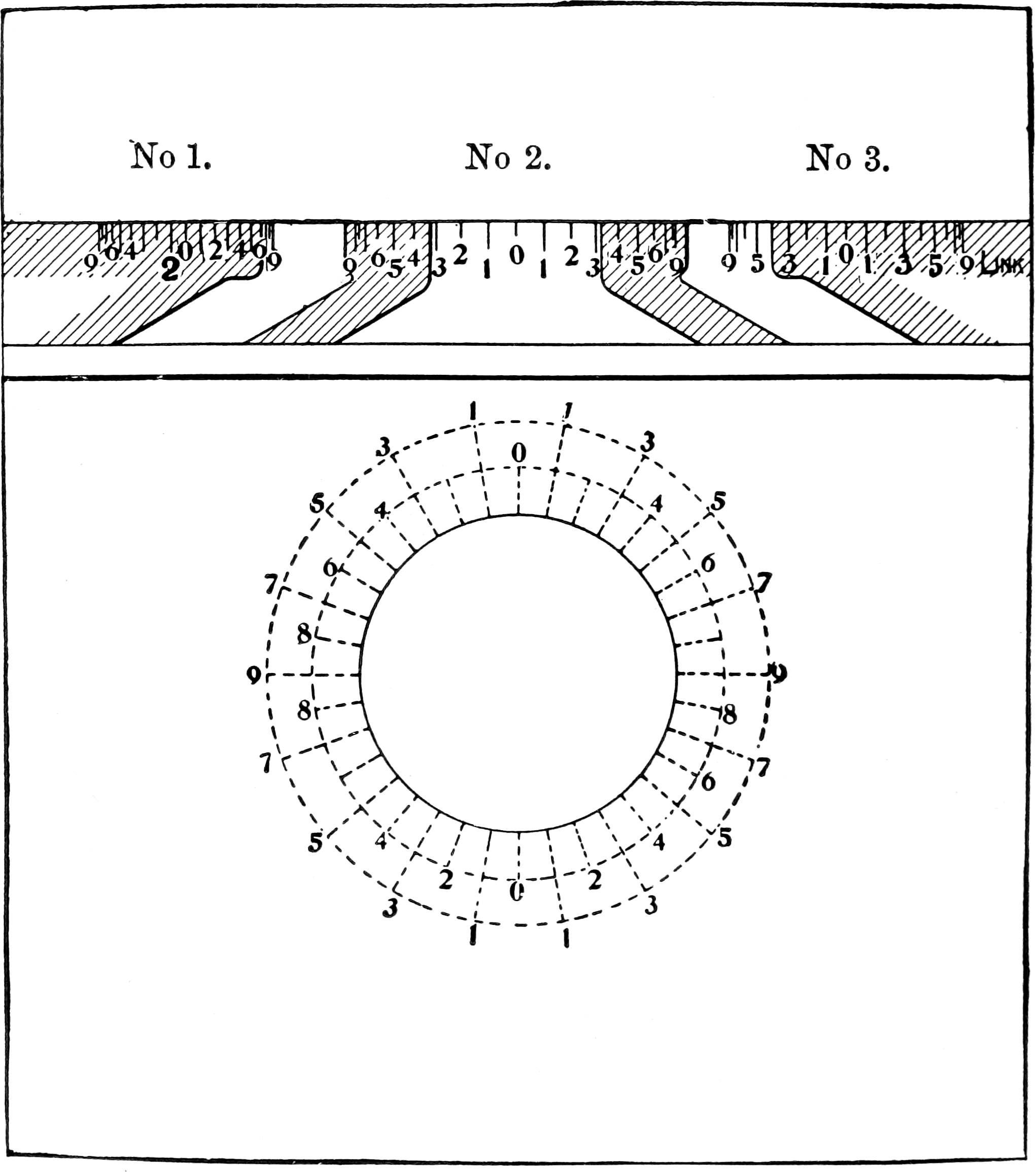 2. The horizontal scales on the port-faces are obtained by projecting up equidistant circumferential marks from various circles having different valve-cranks for their radii. The scale (No. 1) is for the elementary form of valve, without lap; it serves also for link-motion in mid-gear; No. 2 is for a valve having outside lap; and No. 3 is for link-motion “linked up.” The student need not, unless he pleases, trouble himself to investigate the construction of the diagram, which is drawn to scale, so that if copied accurately it will serve to give him the demonstrations desired.