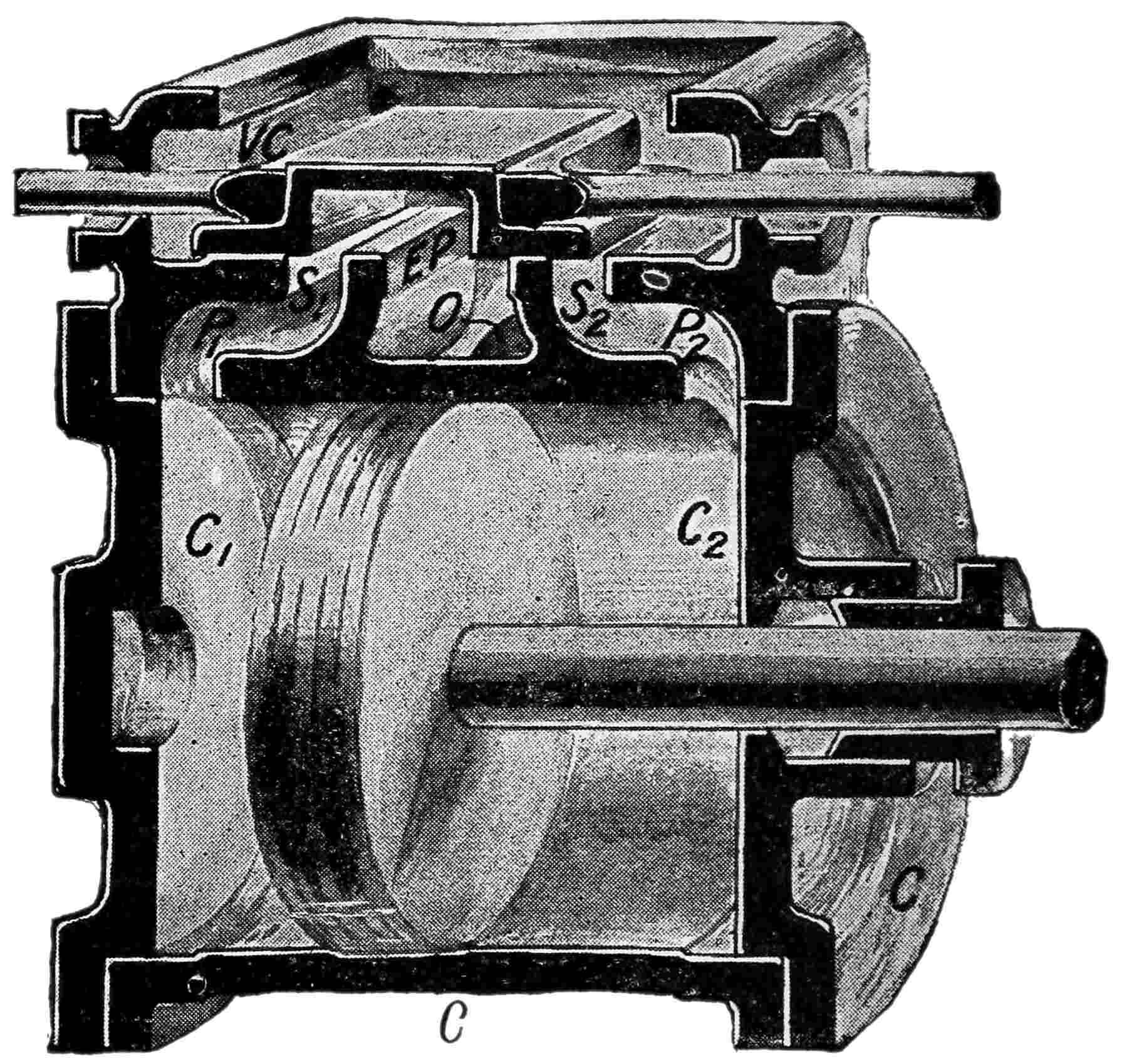 Fig. 2 shows, in perspective, a cylinder and valve-chest with parts removed to make clear the manner in which the two steam-ports 8(S1S2) at the upper ends of the two outer passages (P1P2) afford a communication between the valve-chest (VC) and the opposite ends (C1C2) of the cylinder (C), and to show the passage from the central exhaust-port (EP) to the outlet (O) at which the exhaust steam is discharged. The relationship between this view and the upper part of fig. 1 will be obvious upon a comparison of the two.