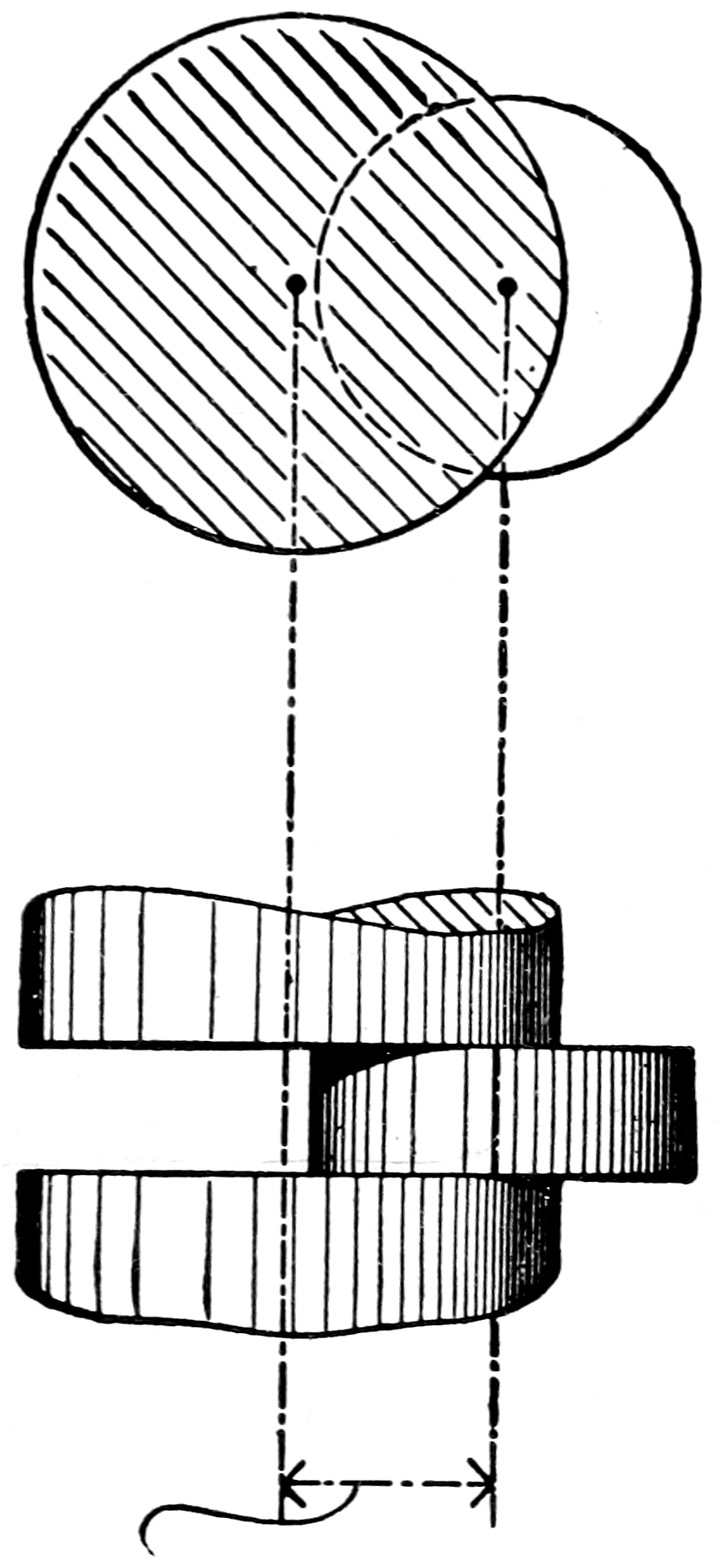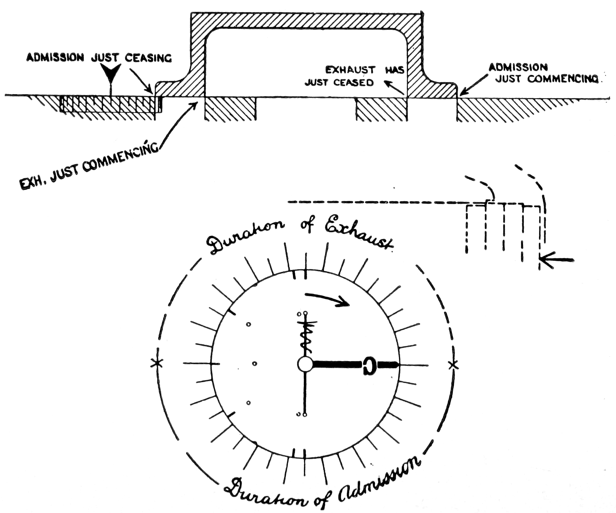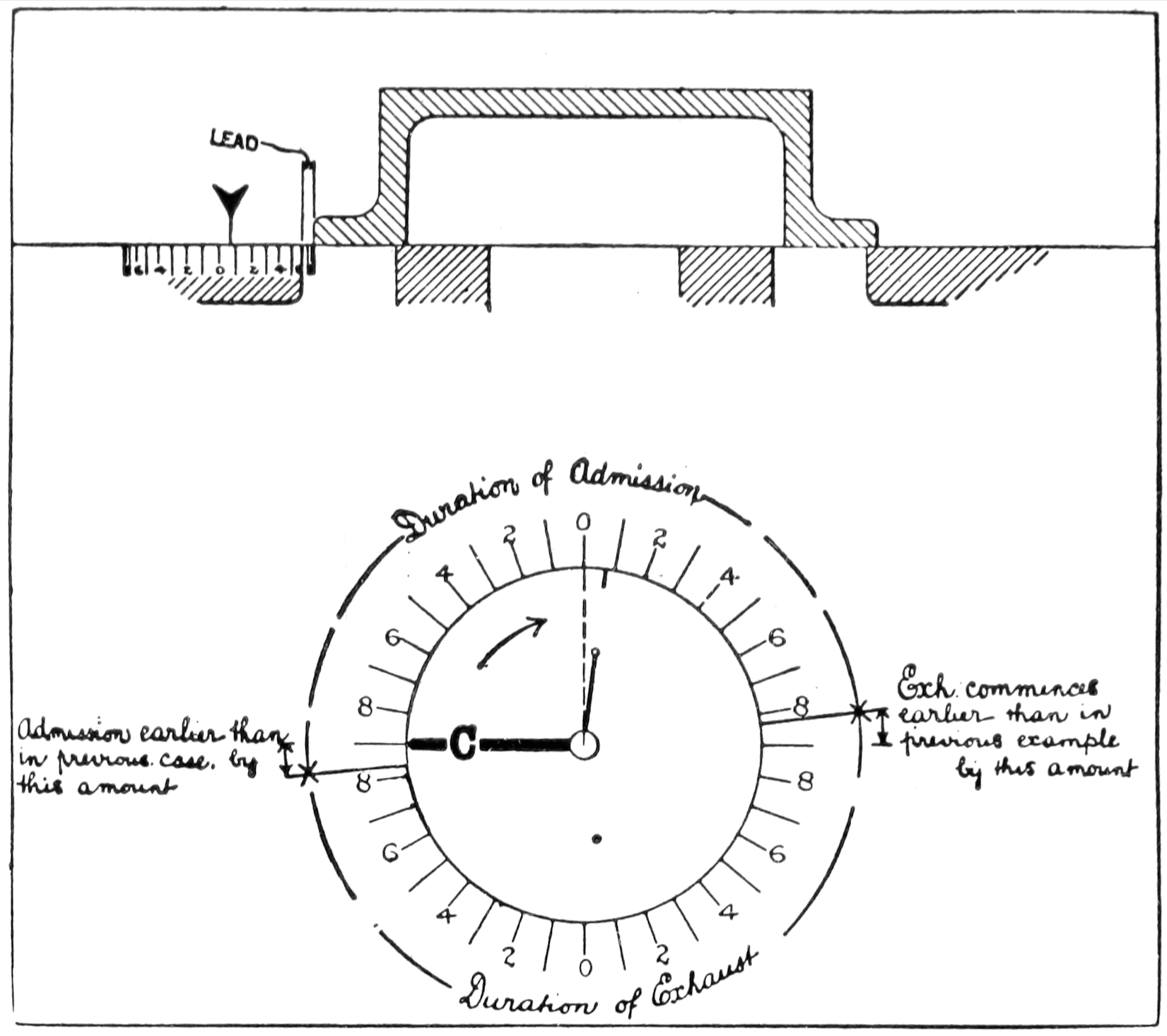 The upper portion of this diagram represents a section taken at right angles to the port-face through a set of steam and exhaust-ports as ordinarily arranged; the graduated ring beneath the section will receive consideration later.
