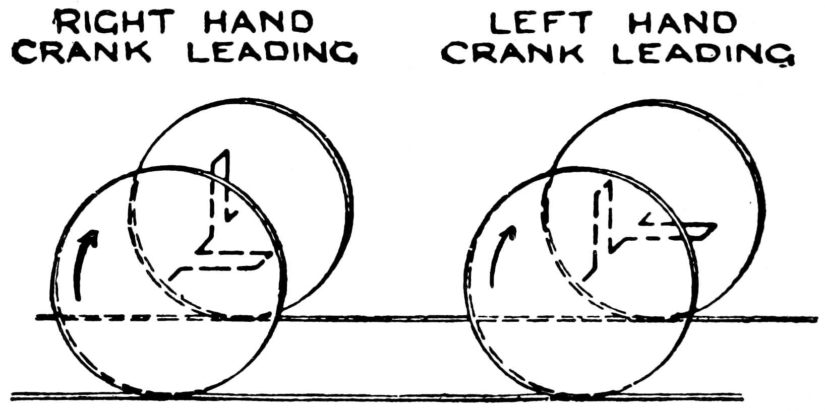 Right-hand Crank to Lead.—The phrases “right-hand crank to lead,” or “left-hand crank to lead,” are sometimes used, and are confusing to beginners; the “leading” crank is that one which leads when the engine is running ahead. In most two-crank engines one of the cranks will be a quarter of a revolution (or less than half a revolution, where the cranks are not set at 90 degs.) in advance of its neighbour, and will, therefore, lead it in the direction in which it should go. Of course, 26that neighbour might be said to lead the other by being three-quarters of a revolution in advance (or more than half a revolution, where the cranks are not set at 90 degs.), and this is where a little confusion sometimes arises; the leading crank must always be taken as that one which is less than half a revolution in advance of its fellow when the engine is running ahead, and in locomotives and similar engines is “left-hand” or “right-hand,” according as it lies to the left or right of a spectator looking from behind the crank-shaft towards the cylinders. (See fig. 12, which shows two arrangements of the driving cranks of an English locomotive. The cylinders are supposed to be to the right of the wheels.)