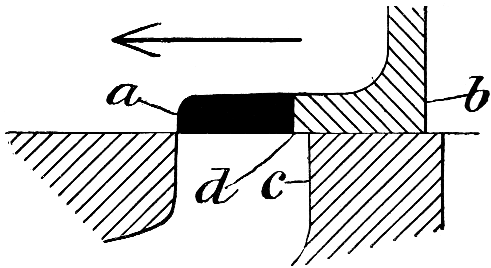 Expansion.—In order that the expansive properties of steam may be utilised, it must be cut off before the piston arrives at the end of its stroke, and on being cut off must not be allowed to commence exhausting immediately, but must be confined in the cylinder, in order that by expanding it may force the piston further before it. The old valve, as we have seen it, did not allow this, and to effect it the faces of the valve are lengthened, so that after the steam is cut off by the edge (a) of the valve (fig. 15) the steam is confined, and expands in the cylinder until the edge (b) arrives at c, when exhaust immediately commences. Now put the piston at the end of its stroke, and put the new valve in a central position (fig. 16). The distance that the valve, when in this central position, overlaps the outer edge 32of the steam-port, is called the “outside or steam lap,” or more commonly the “lap” of the valve, that is, the distance d a (fig. 16).