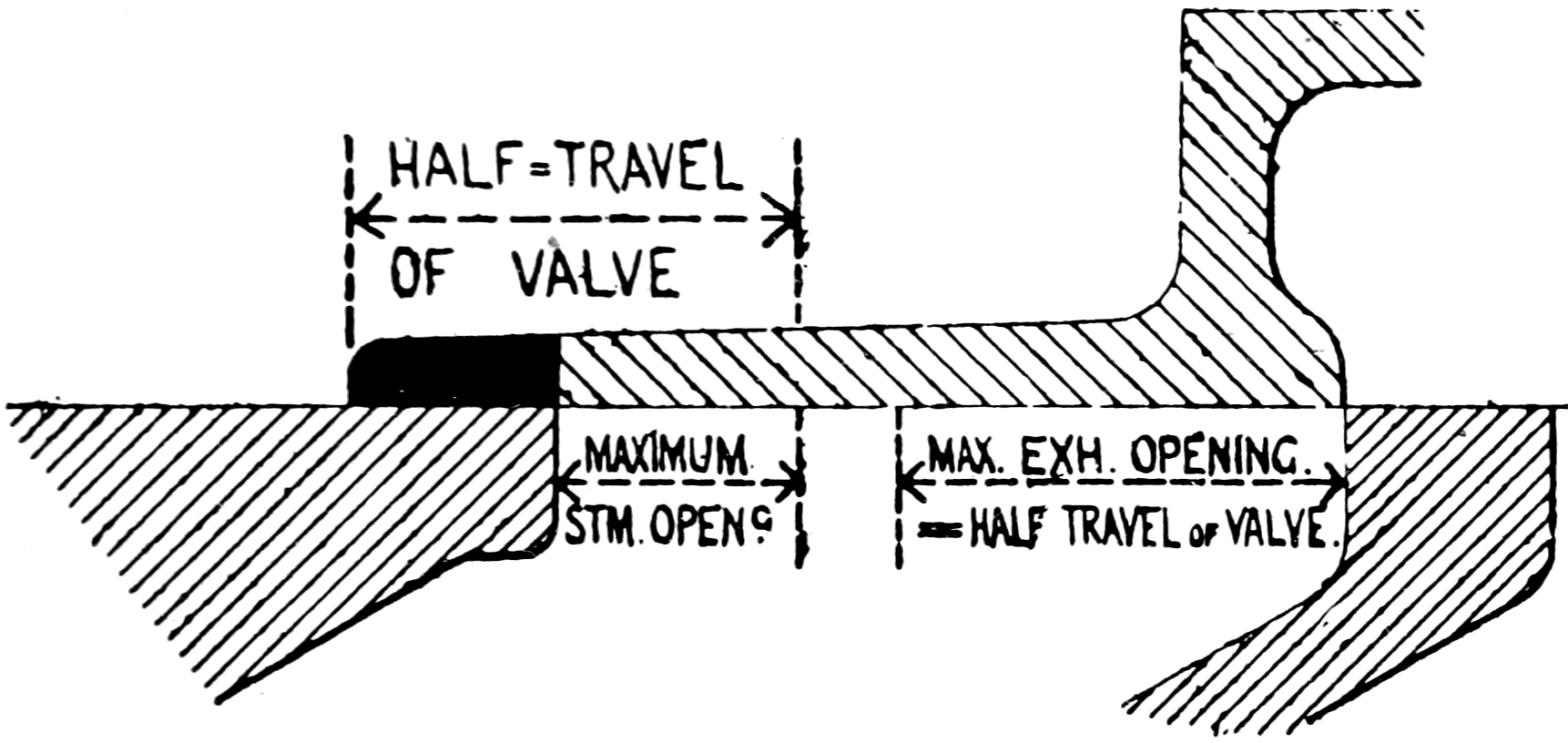 In the case of a quadruple admission valve, such as the Woodbury valve shown in fig. 28, the travel is equal to twice the sum of the steam lap and one-fourth the maximum opening of the port for steam, or 2 × (steam lap + ¹⁄₄ maximum opening of port for steam).