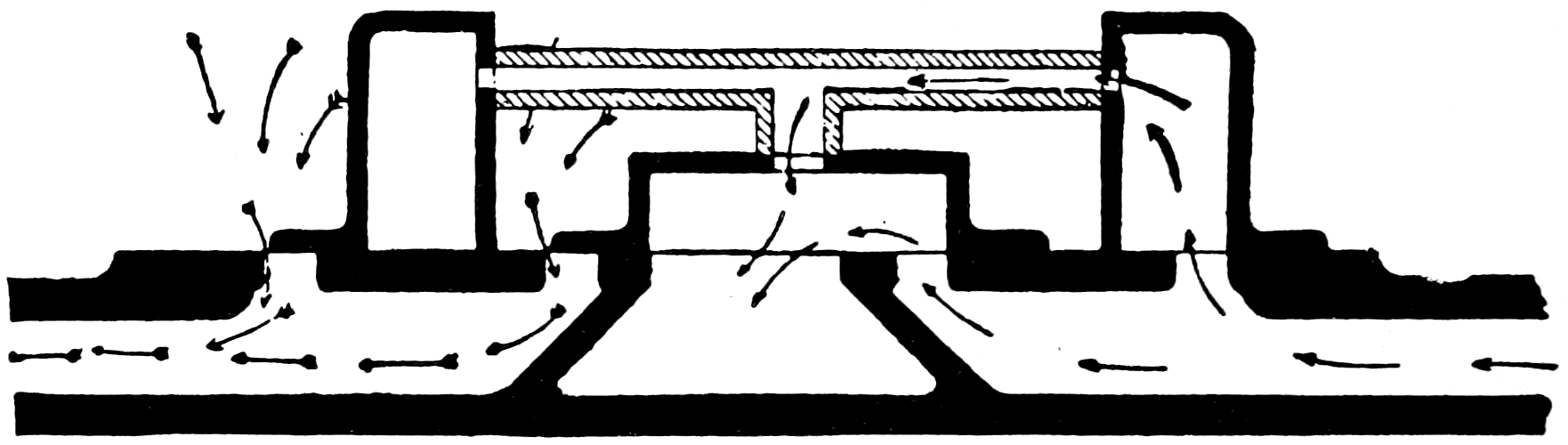 Let us return now to fig. 1. Draw, near the edge of a strip of moderately stiff paper, the section of the elementary form of slide valve illustrated by fig. 5, taking its dimensions from the ports of fig. 1, so that the two views agree in the manner indicated. By sliding this diagram backwards and forwards across the ports of fig. 1, the following explanation of the action of this, the simplest form of slide valve, will be readily appreciated.