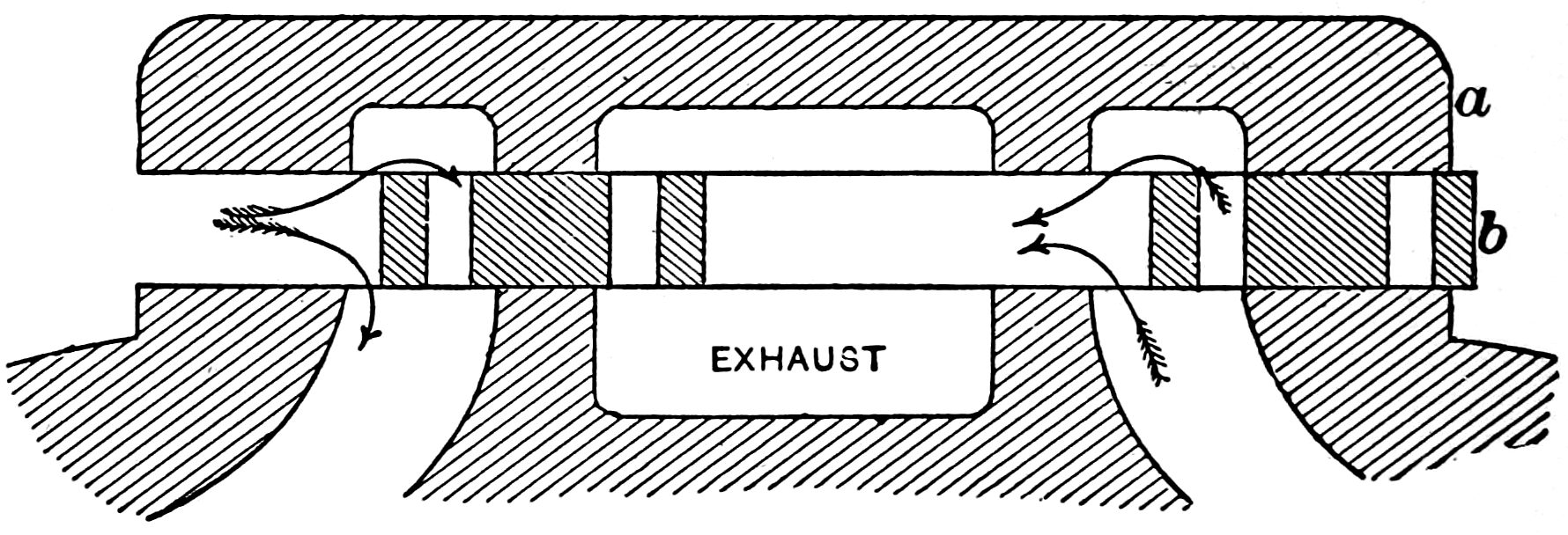 One of the best-known forms of double admission valves is the “Straight Line” or “Sweet” valve, which was invented by Professor John E. Sweet, formerly of Cornell University, and first used by him on the Straight Line engines. This valve is now used by a large number of manufacturers of automatic high-speed engines. The valve is shown in 49section in fig. 27, where a is the “cover plate,” and b is the valve, proper. The valve, b, moves back and forth between the cover plate, a, and the valve seat. The cover plate rests on pieces called “distance pieces,” placed at the sides of the valve. These distance pieces are made of such a thickness that while the cover plate cannot touch the valve, it is so close to it as to make a steam tight joint between the plate and the valve. Therefore, the valve acts as a piston of rectangular cross-section, moving back and forth between the cover plate and the valve seat. The result of its peculiar construction is that a balanced flat valve is secured; a valve which works with very little friction, as there is no surface upon which the steam can act so as to press the valve against the valve seat. The cover plate is kept in place by the pressure of the steam against its back, aided by one or two small springs inserted between the plate and the steam-chest cover.