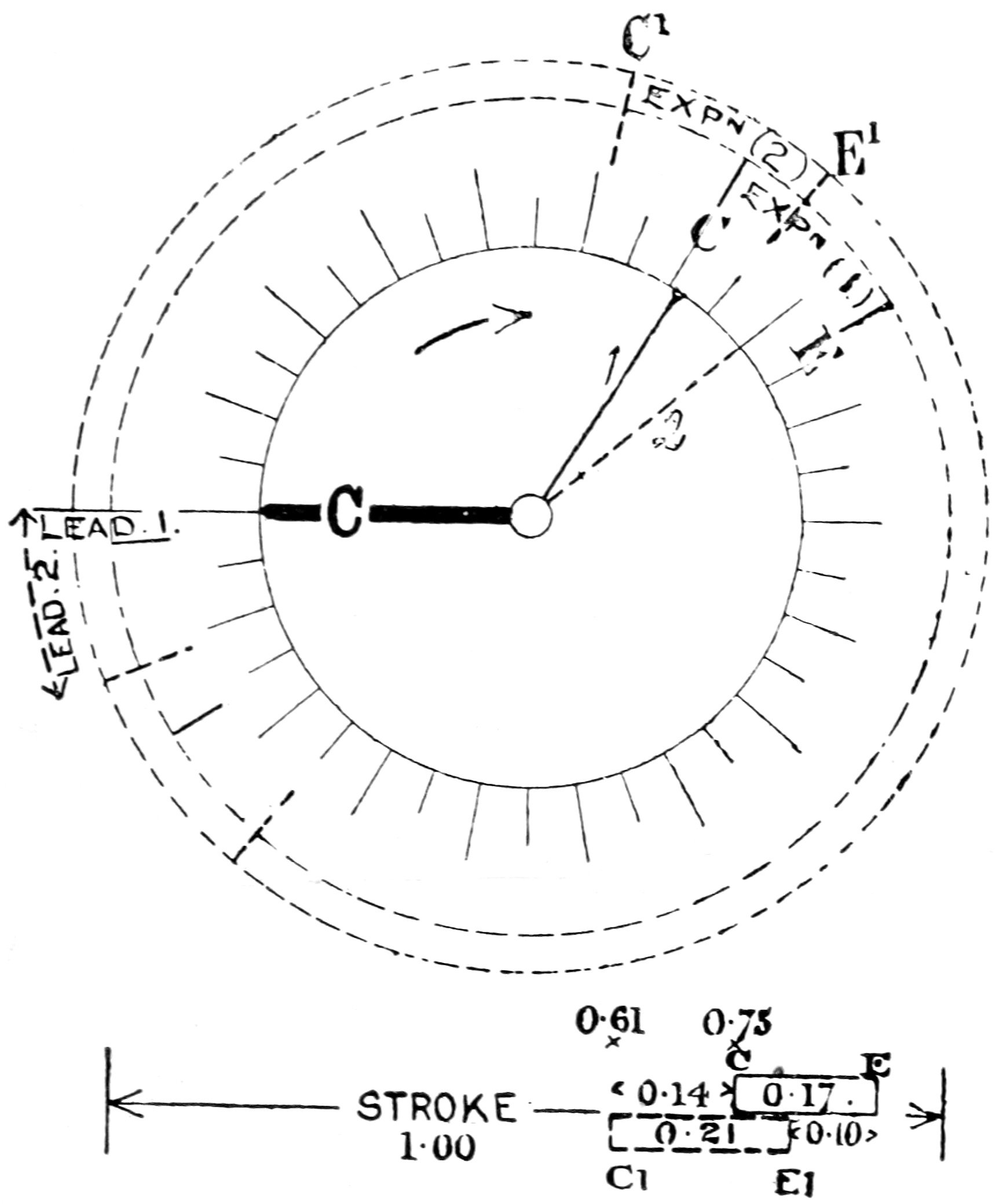 Now we may go on to consider the effect of increasing the advance of an eccentric beyond that which it would ordinarily have (fig. 32). If we suppose our eccentric and valve to give us a cut-off at C and an exhaust at E, expansion lasting 0.17 of the stroke (as shown in full lines, fig. 32), and that by advancing the eccentric we get a cut-off at C1 0.14 earlier, we must not expect to find that exhaust also will be 0.14 earlier (dotted lines, fig. 32), for although the exhaust edge of the valve always gives exhaust at a certain constant period of time later than steam is cut off by the steam edge, yet in that interval the speed of the piston slackens less in this second case than in the first example, and it therefore travels through a greater distance than in the same time-interval taken later in the stroke in the first case. Hence, with increased advance we get earlier cut-off, with expansion of lengthened duration because exhaust is not earlier in the same degree, neither are all the other operations performed by the valve, although they each commence earlier 59and last longer in the stroke, lead included, but admission, of course, excepted. The idea may, perhaps, be more easily grasped by keeping the eccentric and valve in view at an unaltering standard of reference, and when it is desired to consider the effect of advancing the 60eccentric, to imagine instead that it is the setting of the main crank which is altered—which in effect is the same thing, and is, perhaps, easier to reason out.