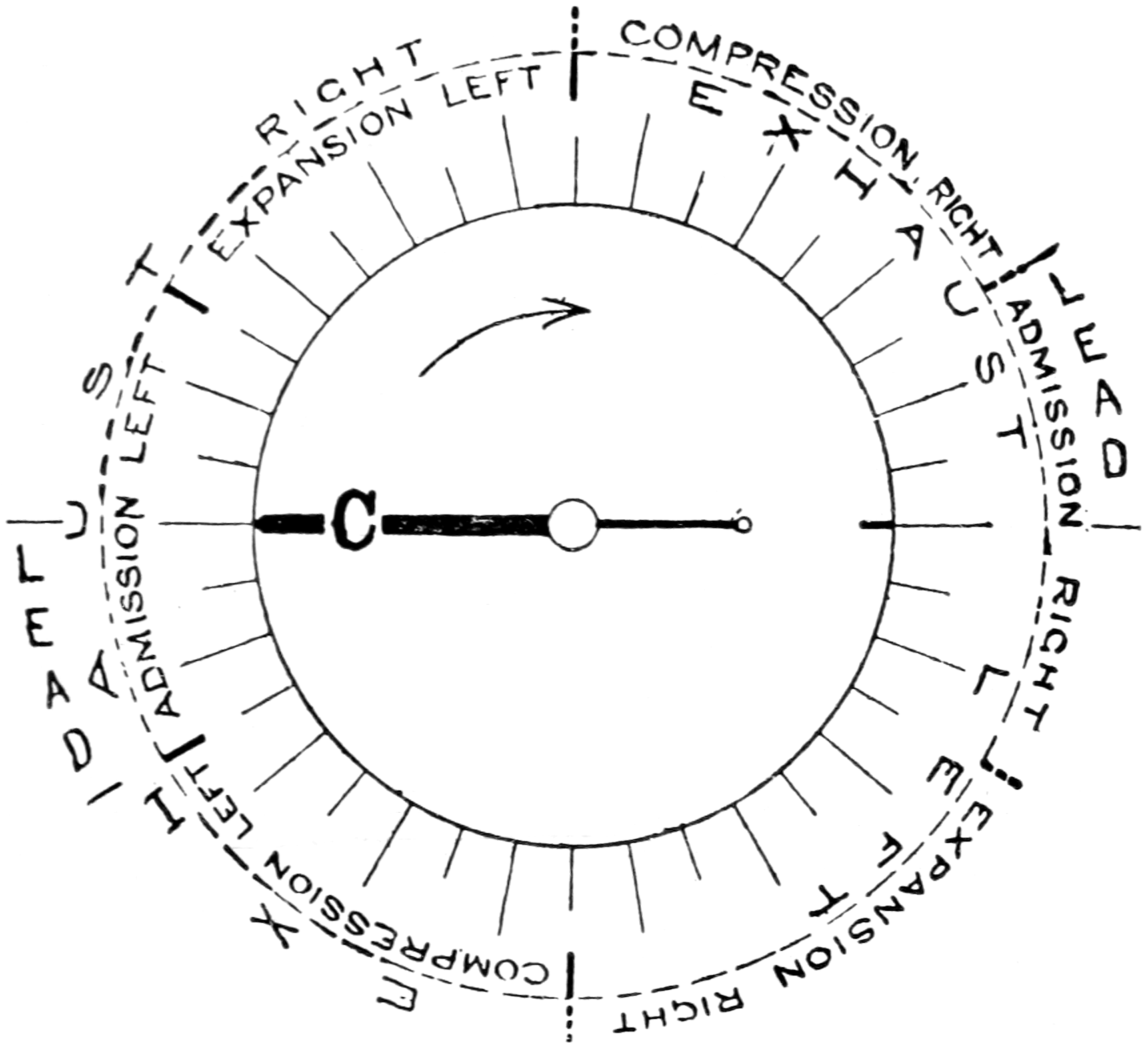 Further, taking the main crank-arm (C) as an index-finger, the position of its end at the points of cut-off, release, etc., with different valves and eccentrics, may be marked in pencil on the circular scale, or better, on a piece of tracing-paper interposed between the disc and that scale; by this means the student will obtain circular diagrams enabling him to compare the results due to different settings and proportions of gear, and he will also discover in what manner those results are affected by individual elements of the mechanism in any given example.