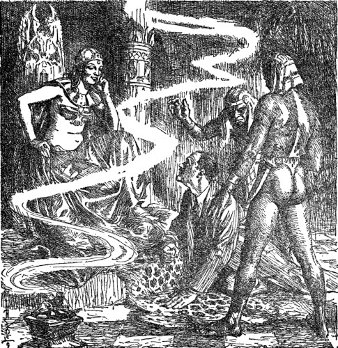Carl was interrupted by the unheralded appearance of one of the Countess Moonard's swarthy-skinned Egyptian servants. The man, tall and sinisterly handsome, was dressed like all the Countess' menials; he wore the brief, exotic attire of a slave in an ancient court or temple. The servant bowed his head and made a peculiar sign which Ruth seemed to understand.