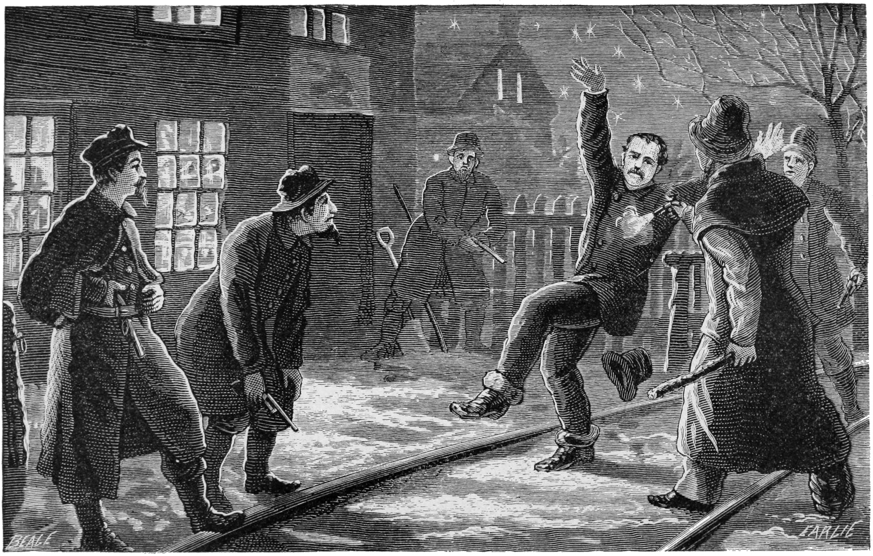 “At about a quarter to ten this morning, February 12, 1877, the stage from Rupert Station rattled up the street, into town, and disgorged its occupants in front of the Exchange 545Hotel. With Messrs. Hughes and Ryon, from Pottsville, the redoubtable Muff Lawler made his appearance. The meeting between Lawler and his old friend McParlan—Muff once knew him as McKenna, and initiated him into Shenandoah Division of the Mollies, a few years ago—was particularly interesting. Stretching out his hand, McParlan inquired of Lawler, as he indulged in a warm shake: ‘Have you the “goods” for the last quarter?’