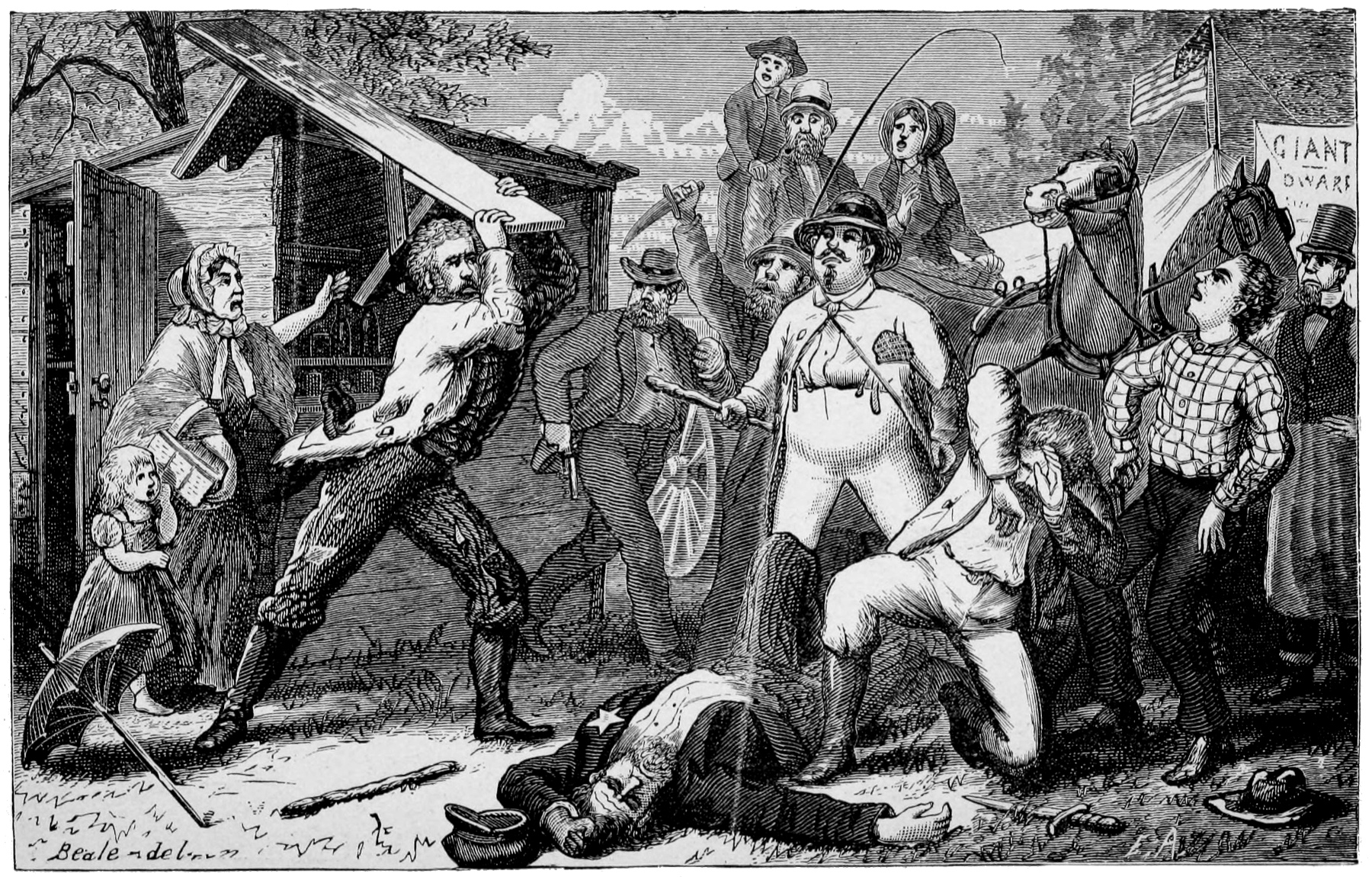 Characters on the margins are very often missing or only partially inked, especially punctuation, more particularly hyphens and periods. Where the context is clear, these lapses have been addressed without any notice taken here. On occasion, an earlier 1877 edition has been consulted to confirm the intent. Where punctuation has been restored in midline, the lapse has been noted here. (331.4 run away[.]; 20.2 service[.]; 259.30 Mine Hill Gap[.]; 388.34 case[.]; 483.35 delayed[.]; 501.2 arrested[.])